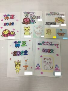 迎春や、2022年の文字、寅の絵などは自由に色鉛筆で塗ってもらいました。色塗りはみんな楽しそう!グラデーションにしたり、一文字一文字色を変えるなど、カラフルに塗り上げてくれました。