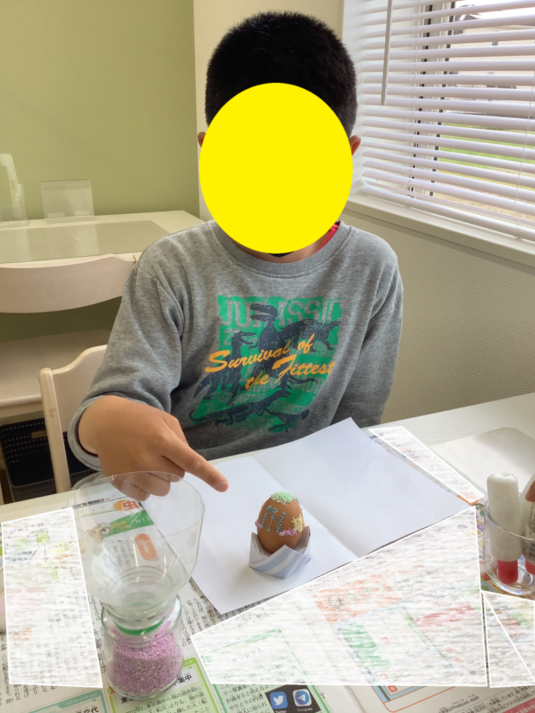 今回は卵の殻にプラス、これまた殻で作られたカラーサンドで絵柄を描いてイースターエッグを仕上げてもらいました。