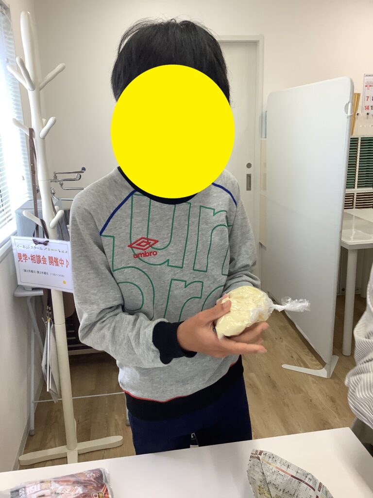 材料が口元まで付いてしまい、縛る作業に苦戦💦中の材料をなるべく下に集め、口元で縛ろうと何度もチャレンジする子もいました。