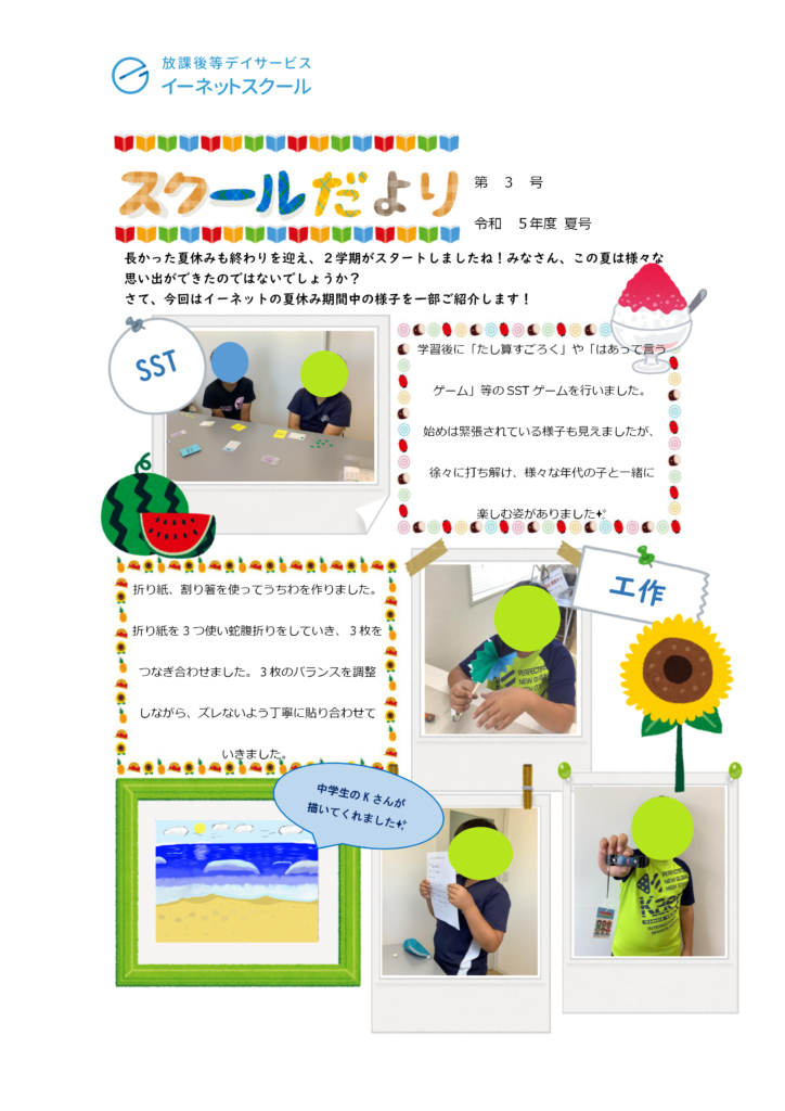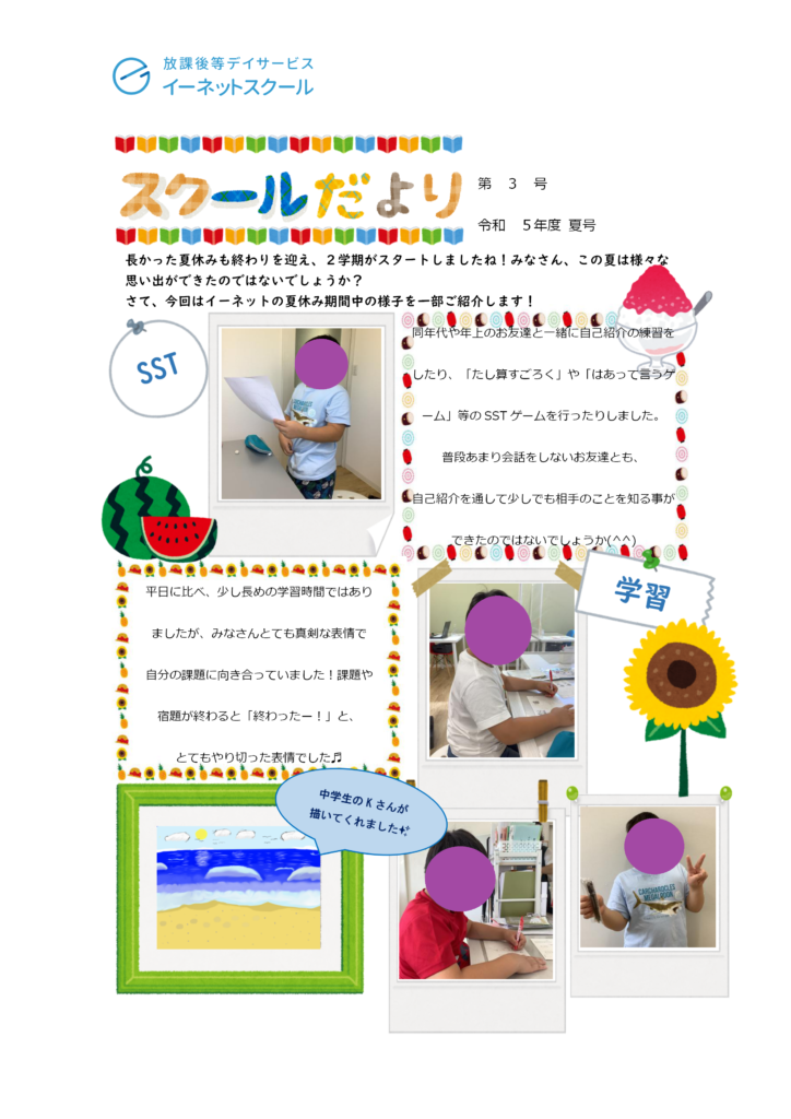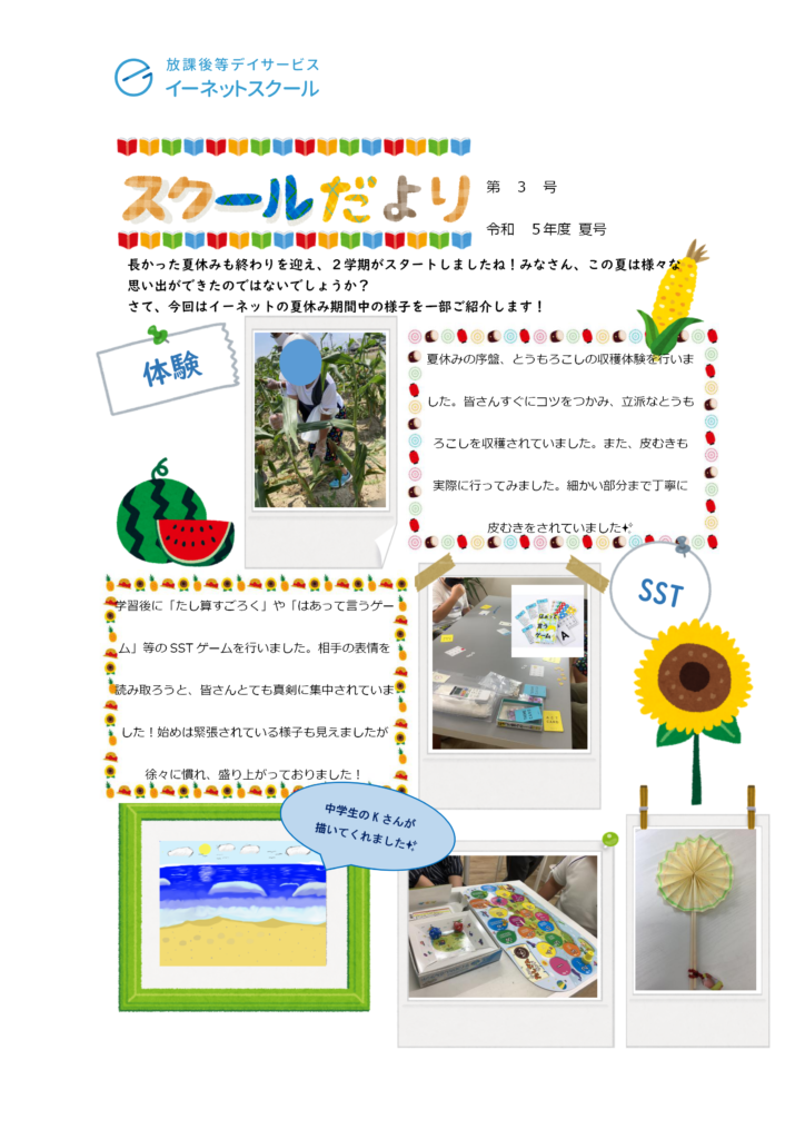さて、そんな9月も終わりを迎える季節ではありますが、夏休み期間中の子どもたちの様子を載せた『スクールだより』第3号を発行いたしました!