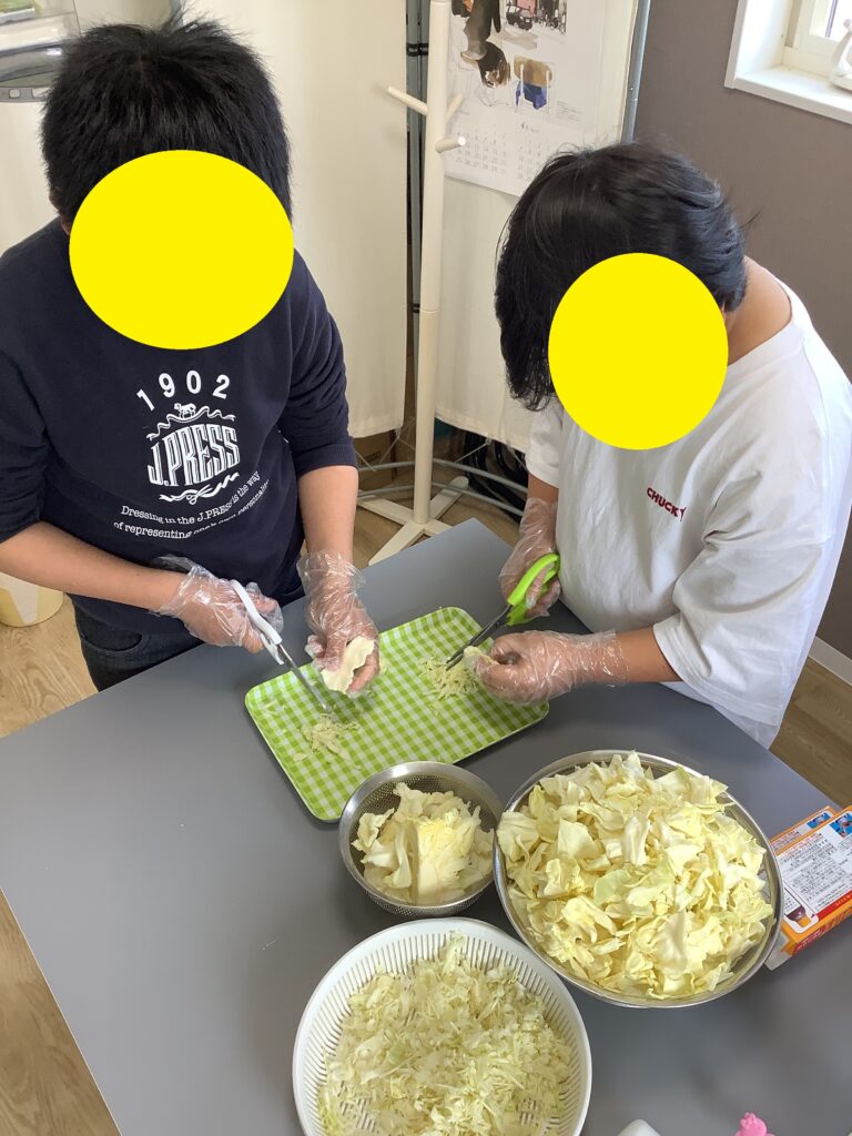 キャベツ切りの練習を学校で行っているMさんには包丁で、NさんとSさんには手でキャベツを一口大にカットしてもらいました。