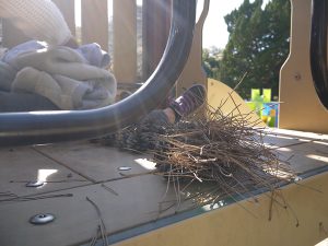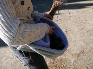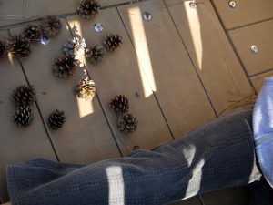 まつぼっくりを集めています。集めたまつぼっくりとKちゃんの写真