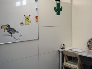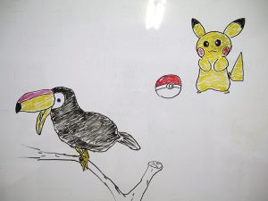 待ち時間に、仲良しのK君&S君がホワイトボードに描いてくれた絵。 このホワイトボードはみんなのその日のスケジュールを記入するものなので、普段なら翌日には消してしまいます。 けれど、 「みんなに見せたいね!」 「消すのはもったいないね」 ということになりました。(^-^)