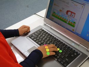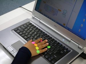 そこで、キーボードと指にシールを貼ってみました。タイピング練習の写真