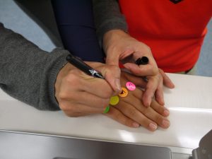 そこで、パソコンのキーボードと指のシールの両方に文字を書いてみました。