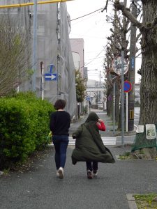 雨に濡れないようにと岡崎が自分のコートを着せたところ、「コートが大きすぎる~!」、「カオナシみたい~」と大笑い。