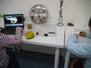 「パソコンを打っているところを描いて!」とT君のいうリクエストに応えて、Nちゃんがデッサン中です。