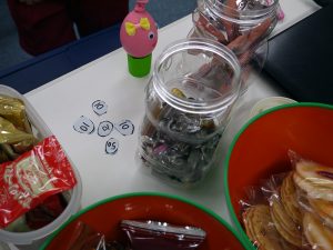 イーネットスクールのおやつは、おやつごとに単位を設けています。決められた単位の中で、食べたいおやつを選んで、自分で計算して選んでいます。
