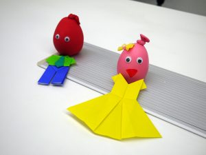 風船人形ができ上がり、折り紙で作った洋服を合わせてみたら、なんだか違和感を感じたようで、首を傾げながらくすくす。