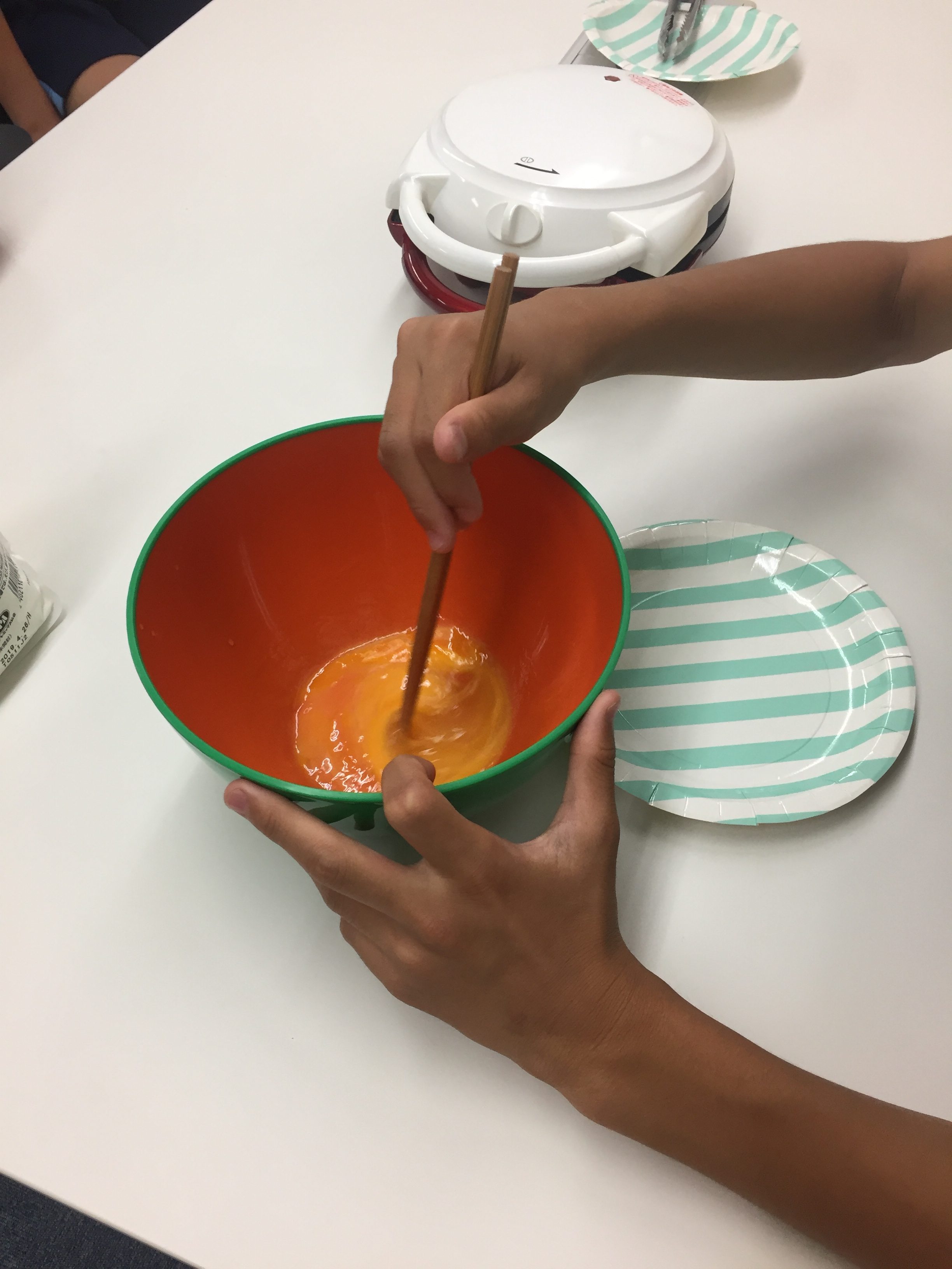 ホットケーキミックスと卵を混ぜたら、水を注ぎ入れます。