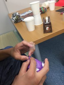 紙コップの固定した所と新聞紙のボールを紐で繋げて、、、