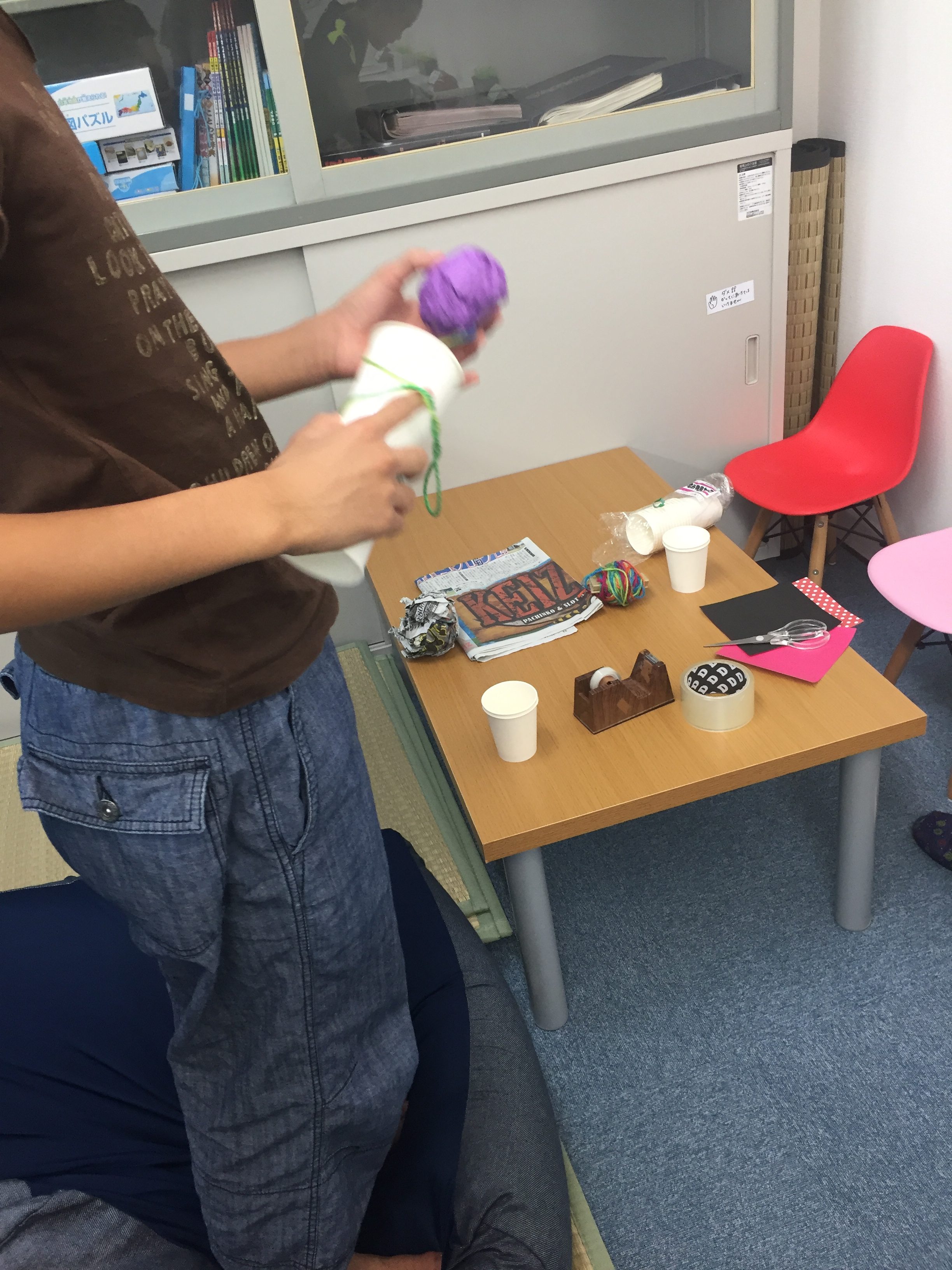 用意する物。紙コップ・新聞紙・テープ・紐・折り紙