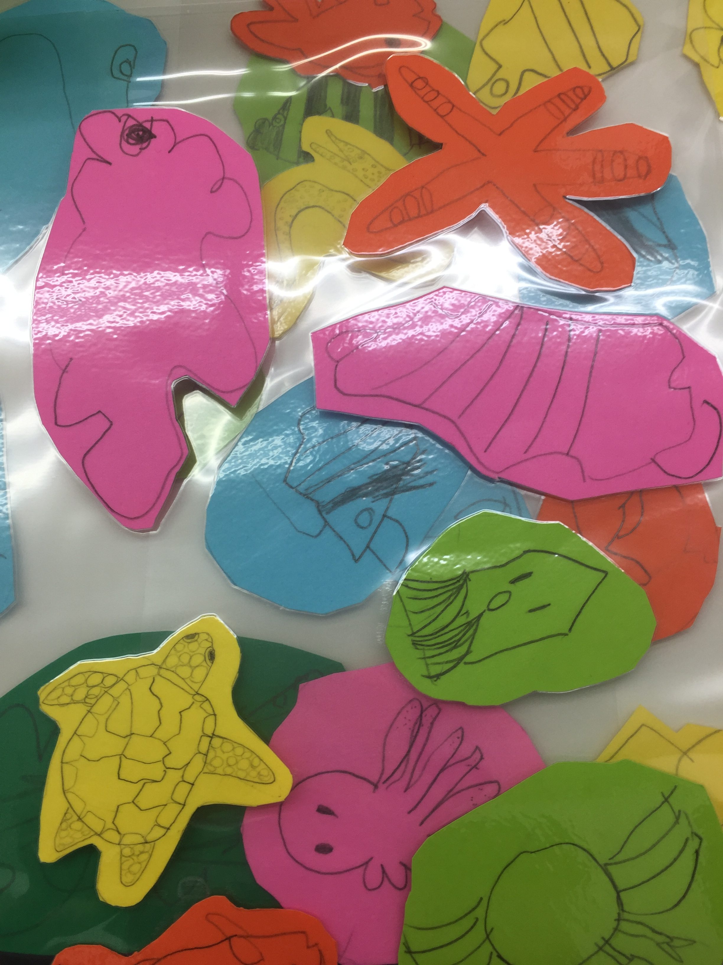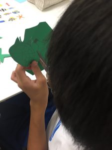 色画用紙に好きなお魚の絵を描いて、はさみで切ります。