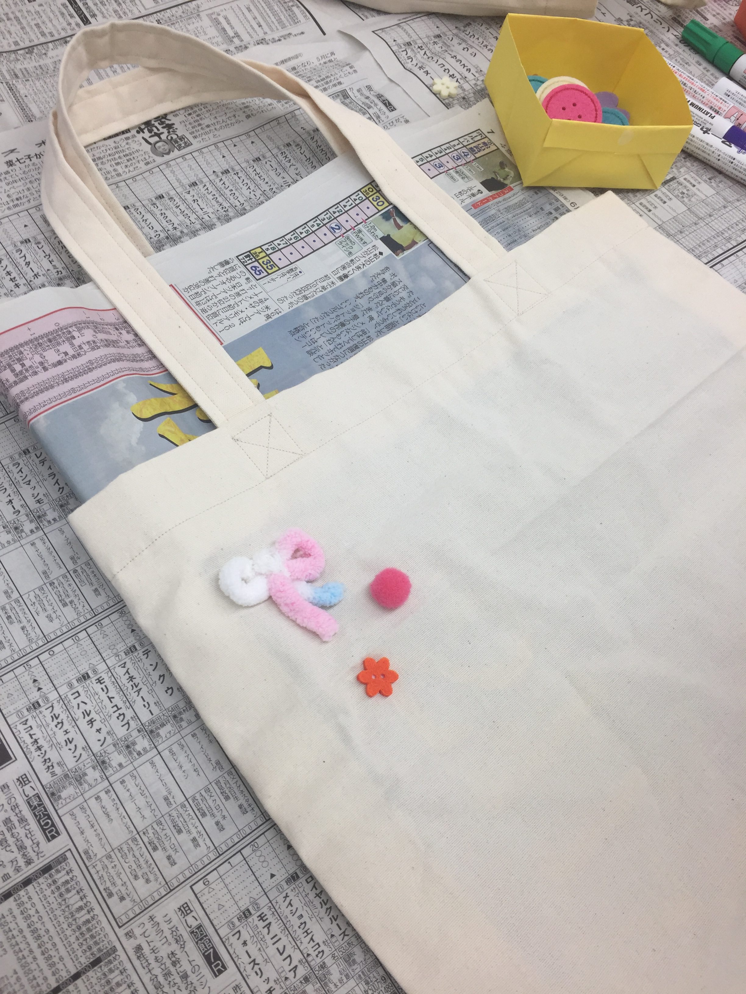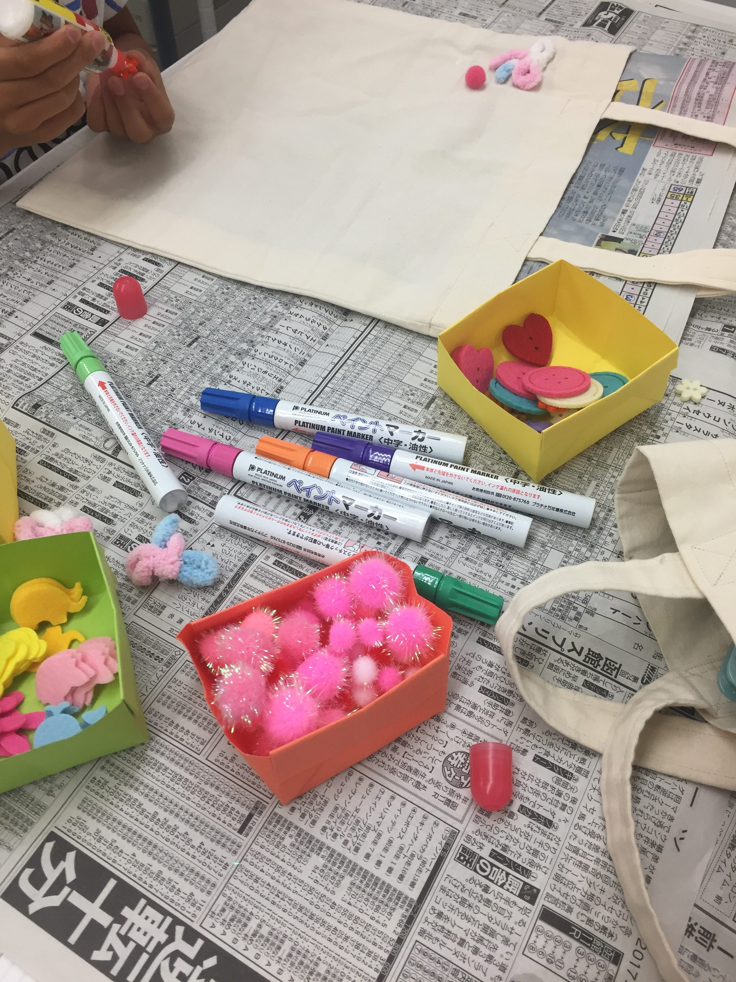 かわいいワッペンやフワフワのボール、カラフルなペンで飾り付けします。