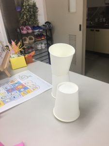 狙いをすましてバン!と叩けば、見事紙コップが倒れました。