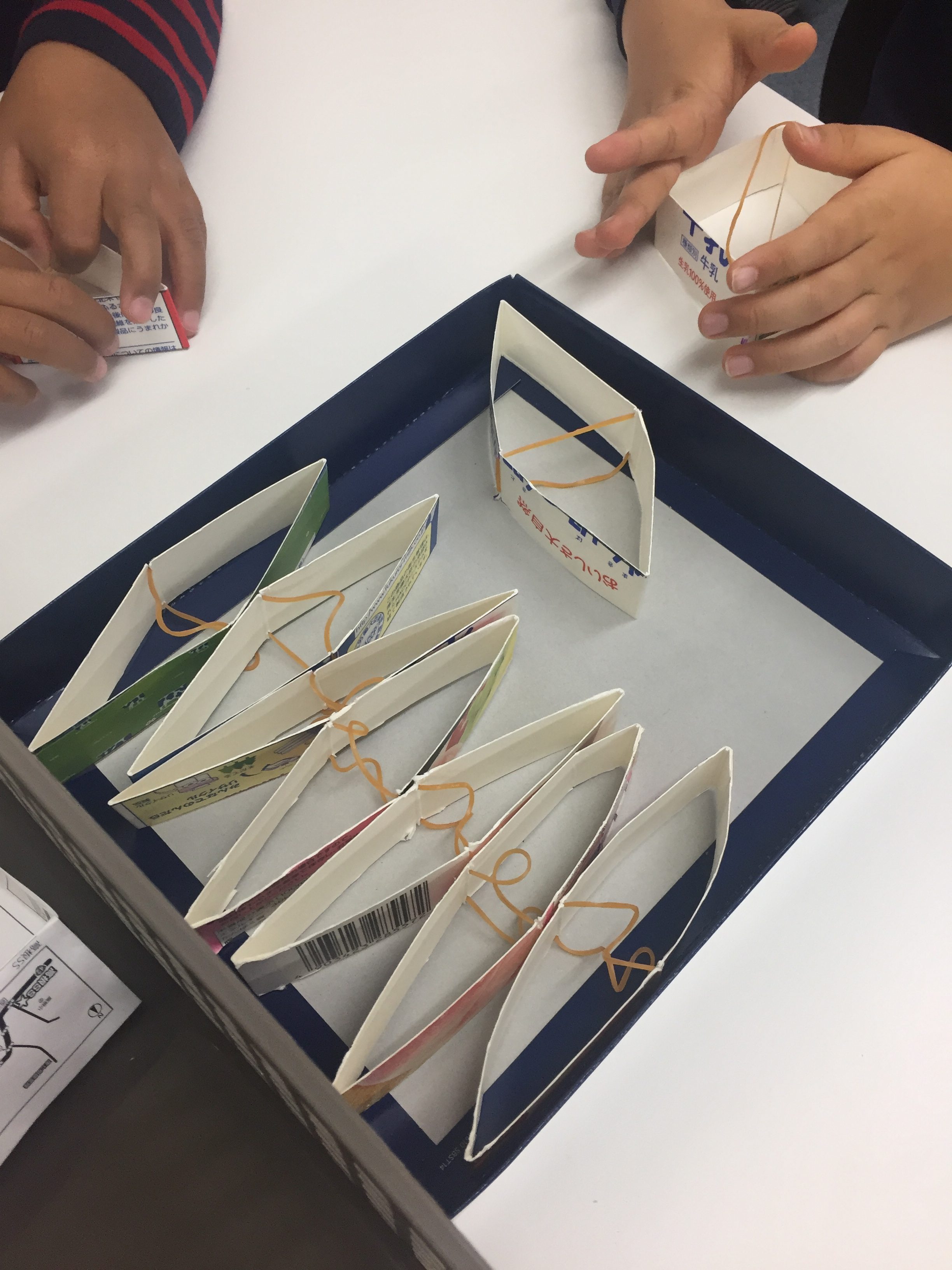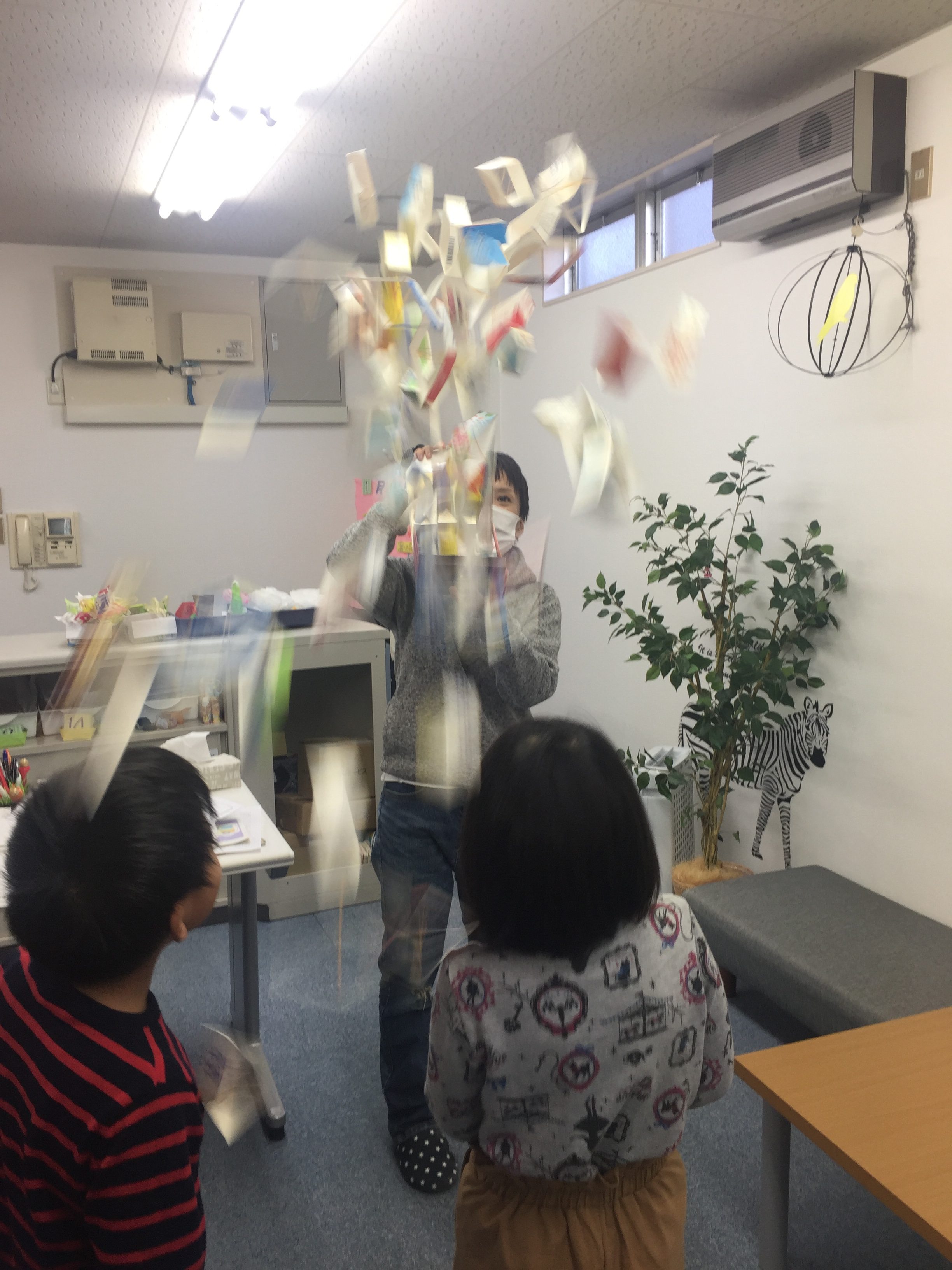 「お母さんたちにも見せたいね」ってことで、お迎えのお母さんたちも巻き込んでの、楽しいびっくり箱作りとなりました。