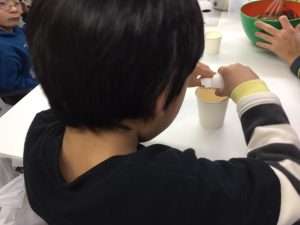 材料を図ってくれたのは、最年長のYくん!卵割りに挑戦した、最年少のBくん!