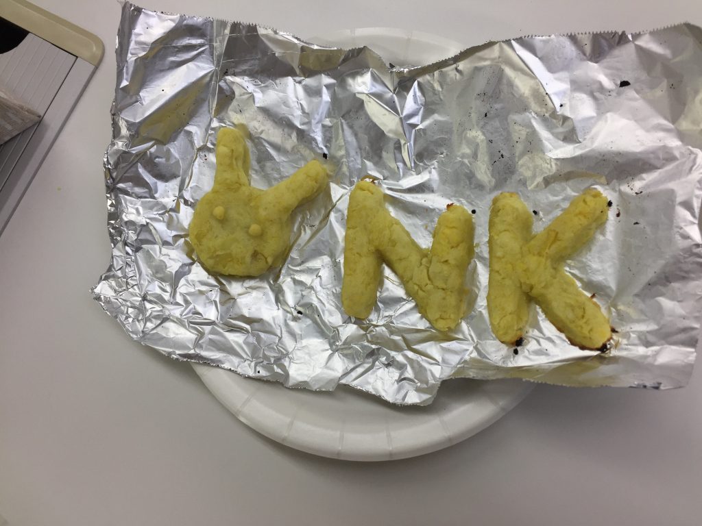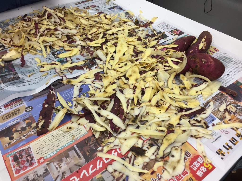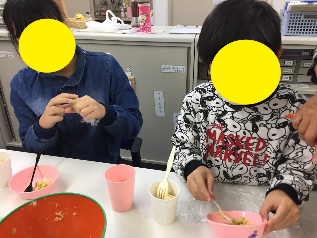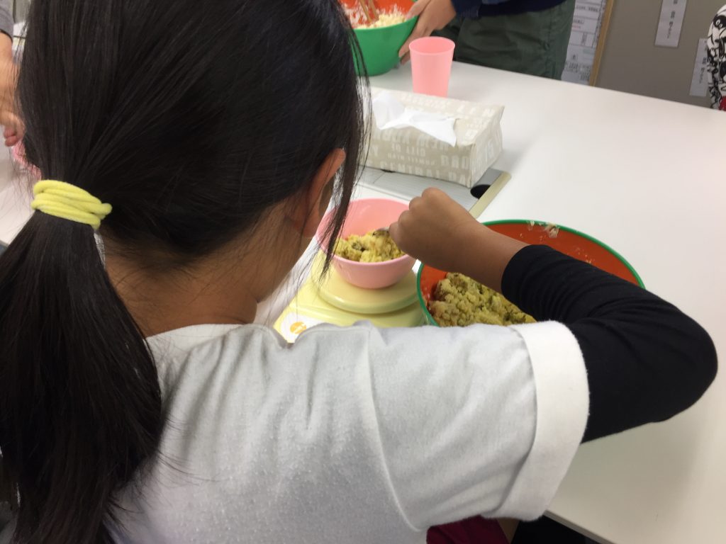 続いてスイートポテトづくりです。面白いのはその形!自分のイニシャルや、キャラクターを型取るなど、その子だけのオリジナルスイートポテトが出来上がりました。あまりに良い出来のスイートポテトを前に、食べようか?持ち帰ろうか?前と悩む子も・・・食欲が勝り美味しそうに食べている子もいました^^