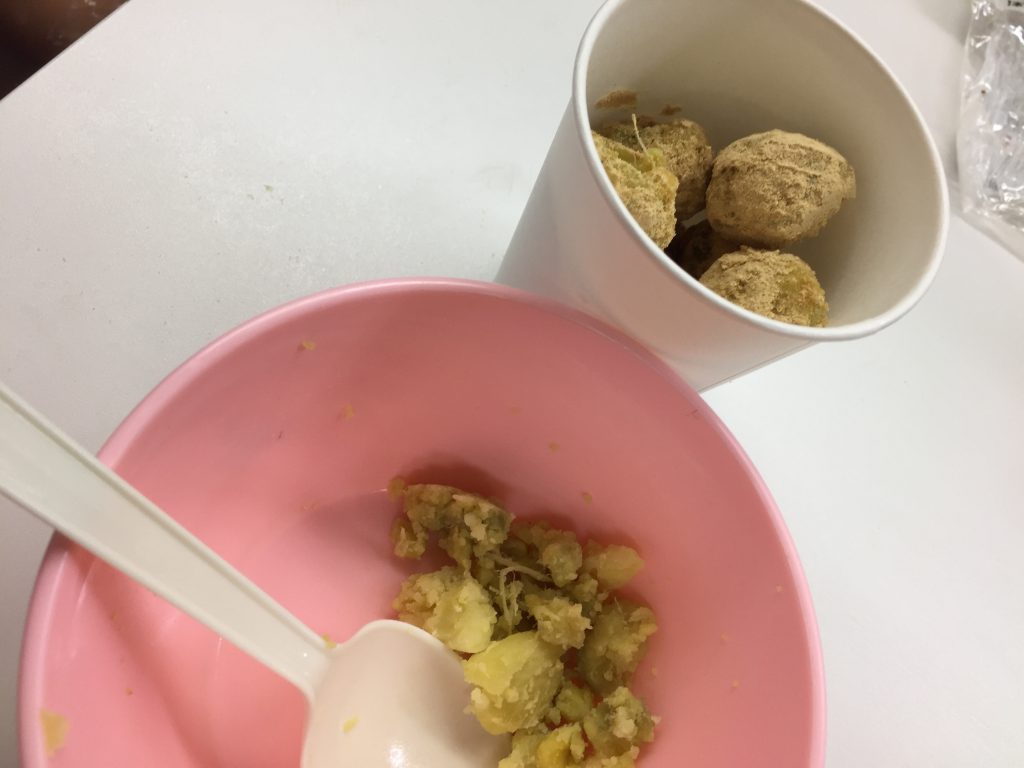 子どもたちは、お芋の皮をむいたり、蒸かしたての熱々のお芋をつぶすしたり、何ができるかな?と興味津々の様子の中、おやつ作りはスタートです。