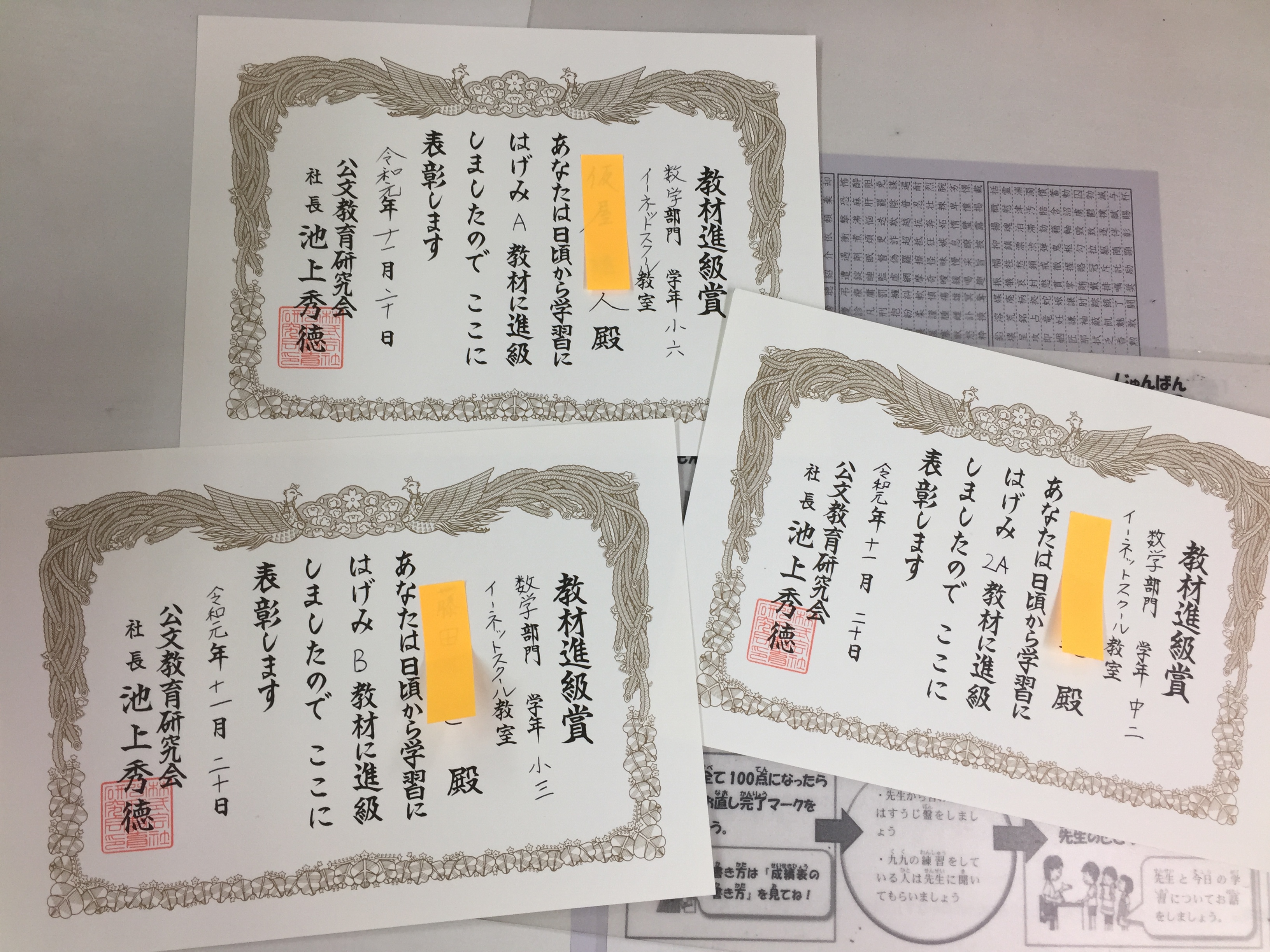 スクールでは、公文の教材プリント1~200を終了ごとに、教材終了テストを行っています。得点からその教材での力が十分であり、目標時間内で終えることができた時には、次の教材に進んでもらっています。 昨年11月より進級時には賞 […]