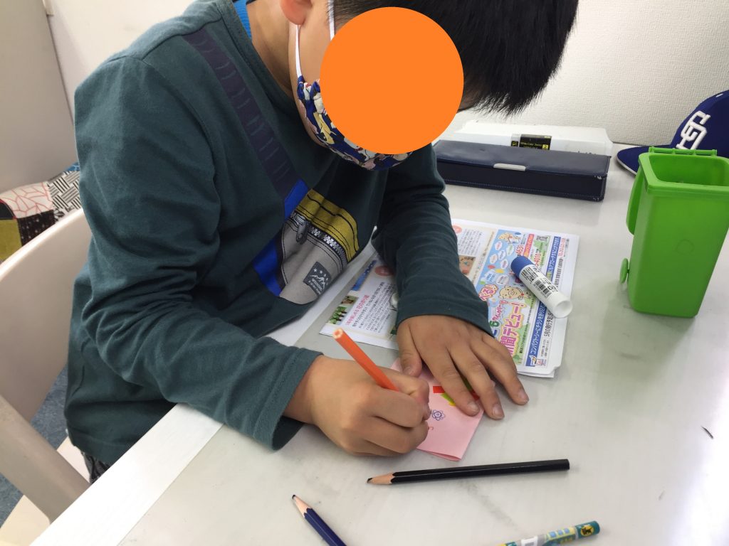 お母さんに似合う色やデザインを一生懸命に考えながら作成する子どもたち。感謝の気持ちがいっぱい詰まったカードができました♪