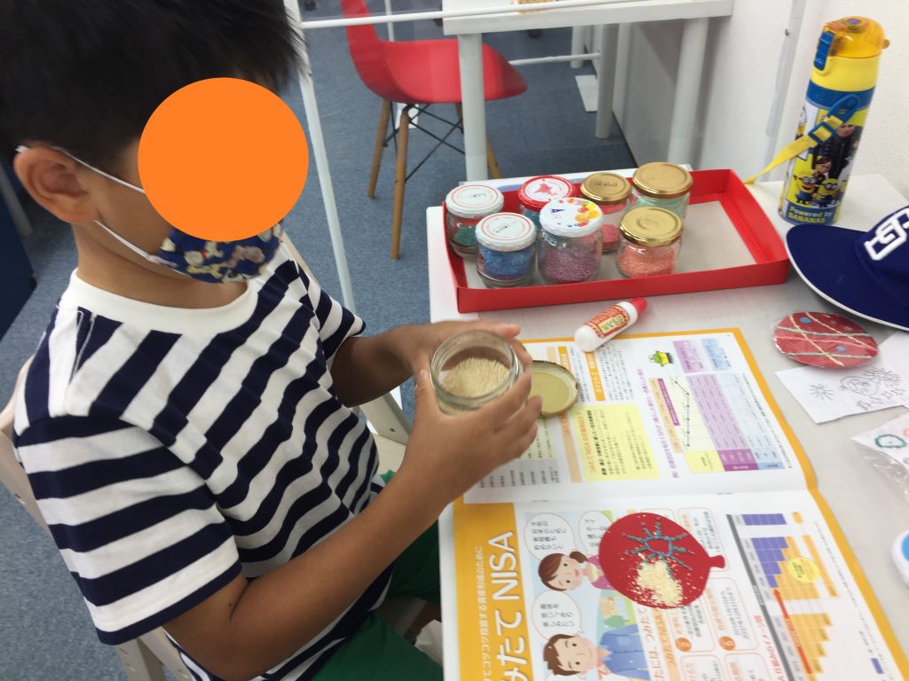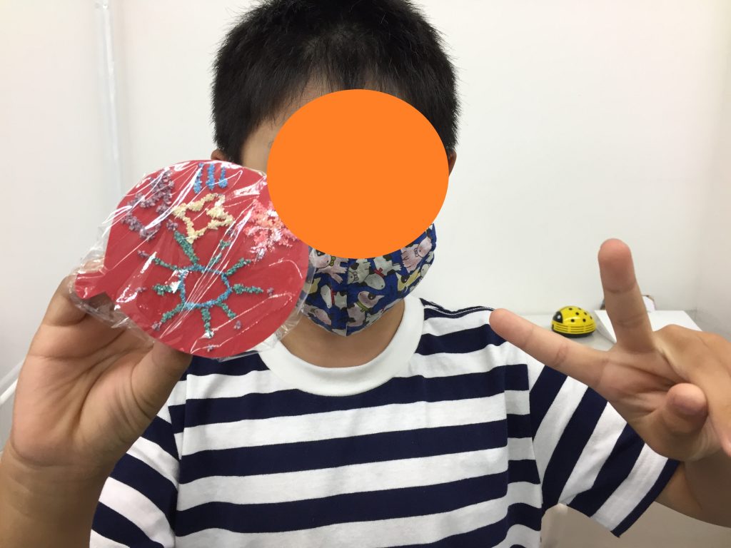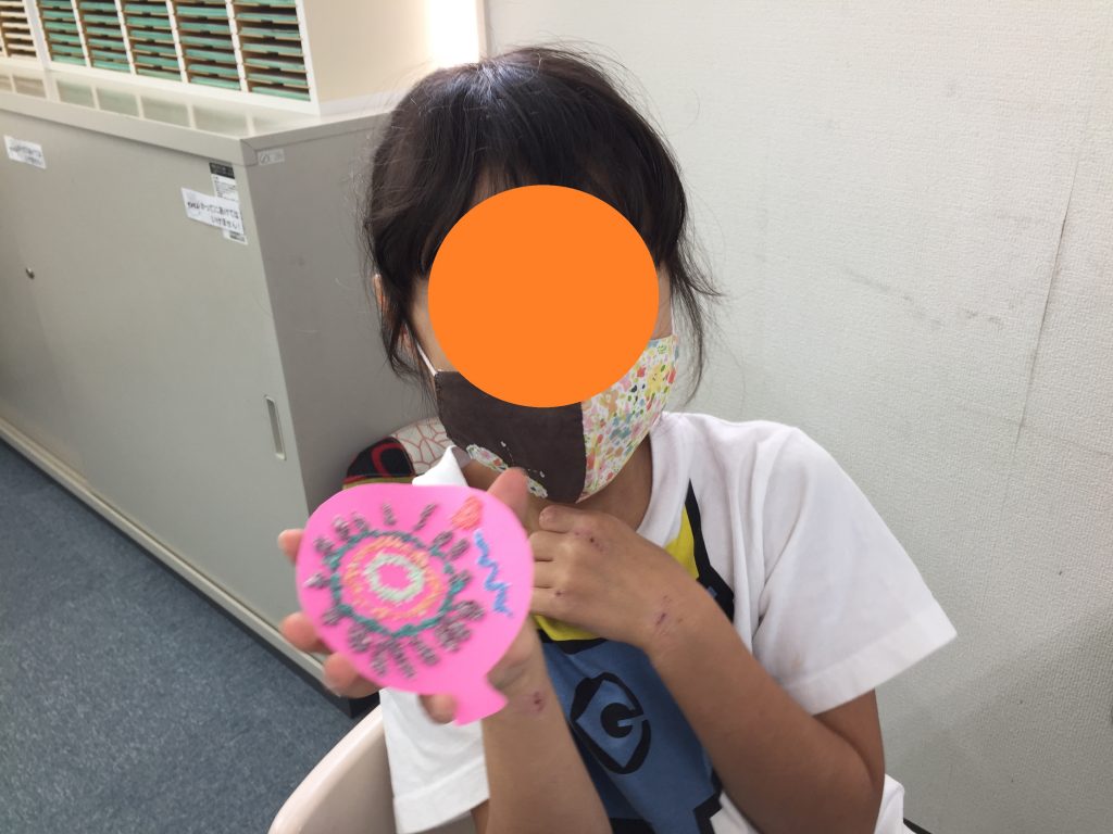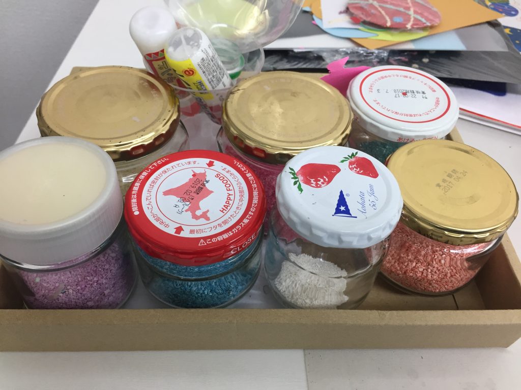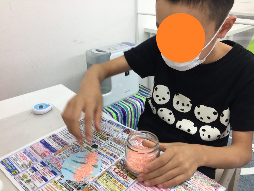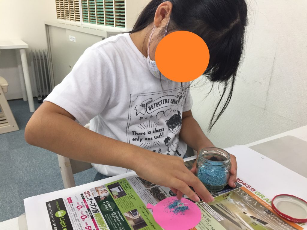 スクールでも、少しくらいは夏らしいことを…と、久しぶりに職員お手製の砂(たまごの殻で作ったもの)を出し、砂絵で水風船の台紙に柄付けをしました☆★
