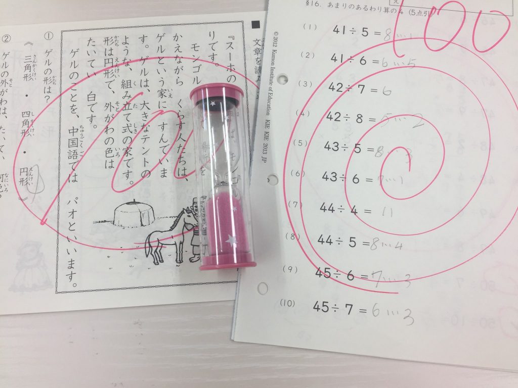 スイッチが入るまで少し時間はかかりますが、エンジンがかかるとやる気モード全開!砂時計で、1枚3分を目標にしながらやり切りました(‘ω’)ノ