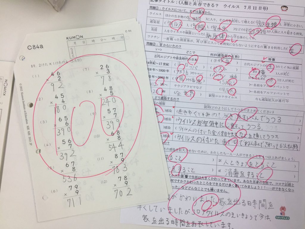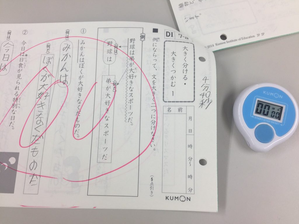 この日は、くもんを1枚あたり4分で取り組むのを目標とし、1枚ずつストップウォッチで測ってもらい、時間の感覚をつけてもらう練習をしました。