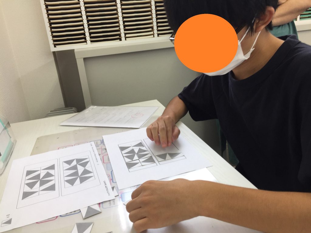 残った時間でビジョントレーニング!Yくんはスクールでは初めてでしたが、パネルを使用しての図形づくりは難問までスラスラ!