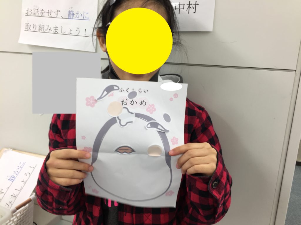 福笑いは、意外にもやったことのない子が多く…みんな初挑戦でしたが楽しめたようです♫作った作品を前に並べて、みんなで品評会もしました!すてきで賞にびっくり賞におもしろいで賞を、みんなで投票しました☆★