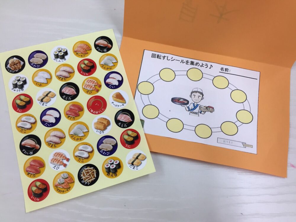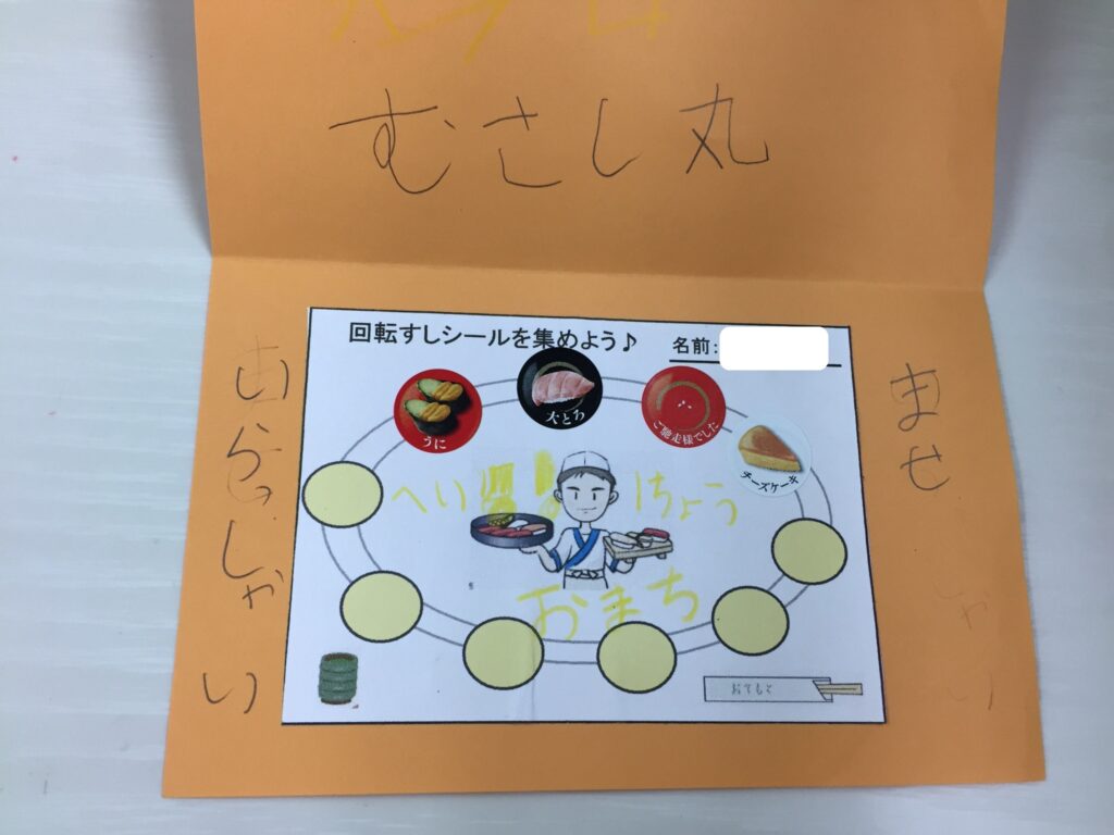 始めて間もないですが、子どもたちはお寿司に目がない様子!回転レーンの台紙に集めていくのですが…好きなネタばかりで攻める子やサイドメニューから攻める子など、子どもたちの好みや個性が出ておもしろい(^^)/