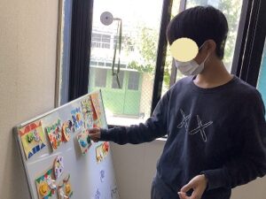 その様子や工作は10月の活動として入口のホワイトボードに飾っています。 とても素敵な作品がいっぱいです。