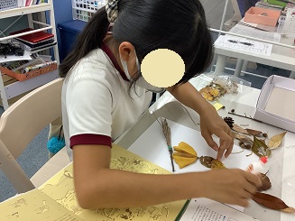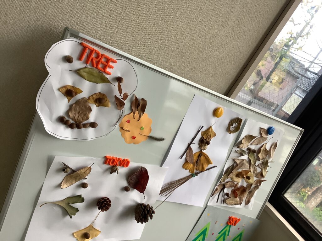 先日は子供達と秋探しに行きました。その時に見つけた落ち葉や木の実で作った作品が入口のボードに飾られています。