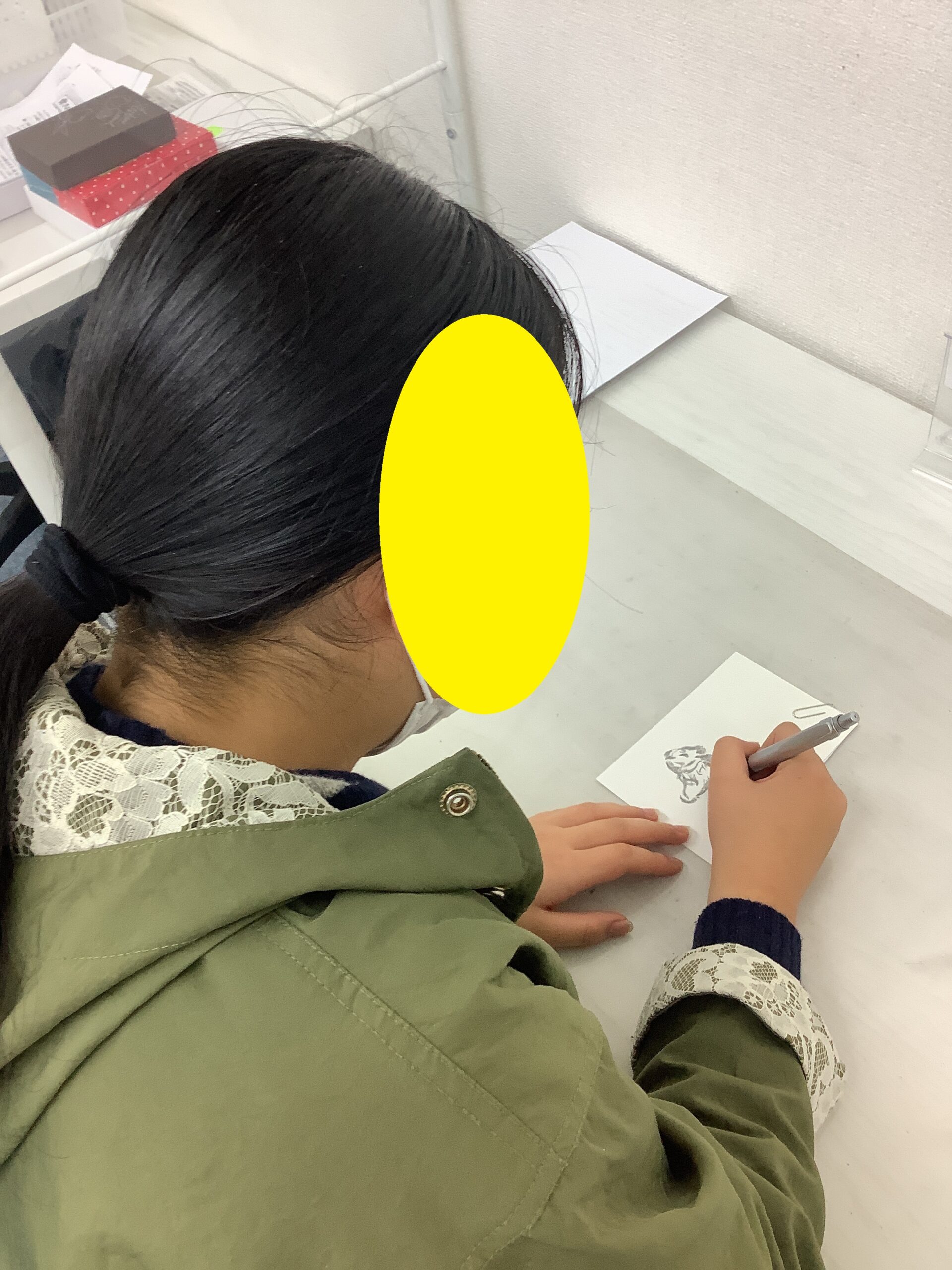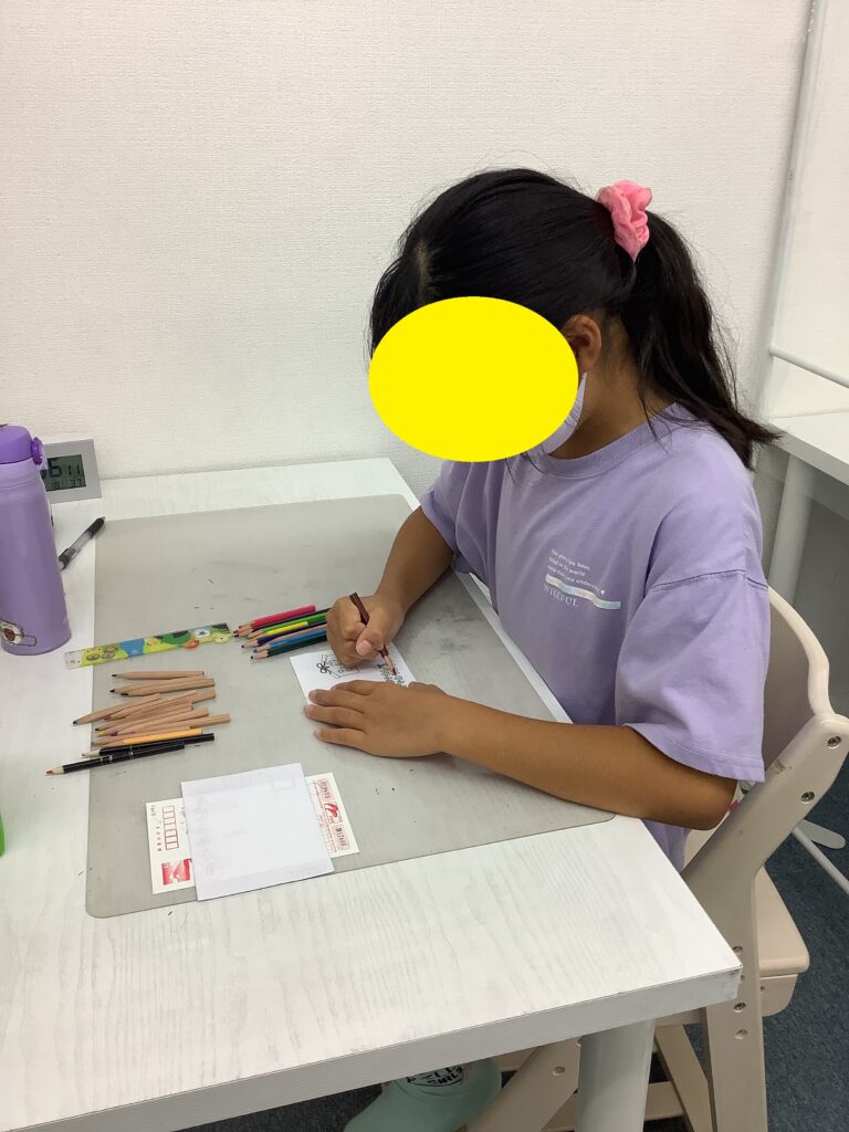 課題の中でなぞりの練習をしている子には、住所のなぞり書きに挑戦してもらいました。持ち慣れないボールペンを手に、頑張って丁寧になぞってくれました。日ごろの成果がばっちり出ています!