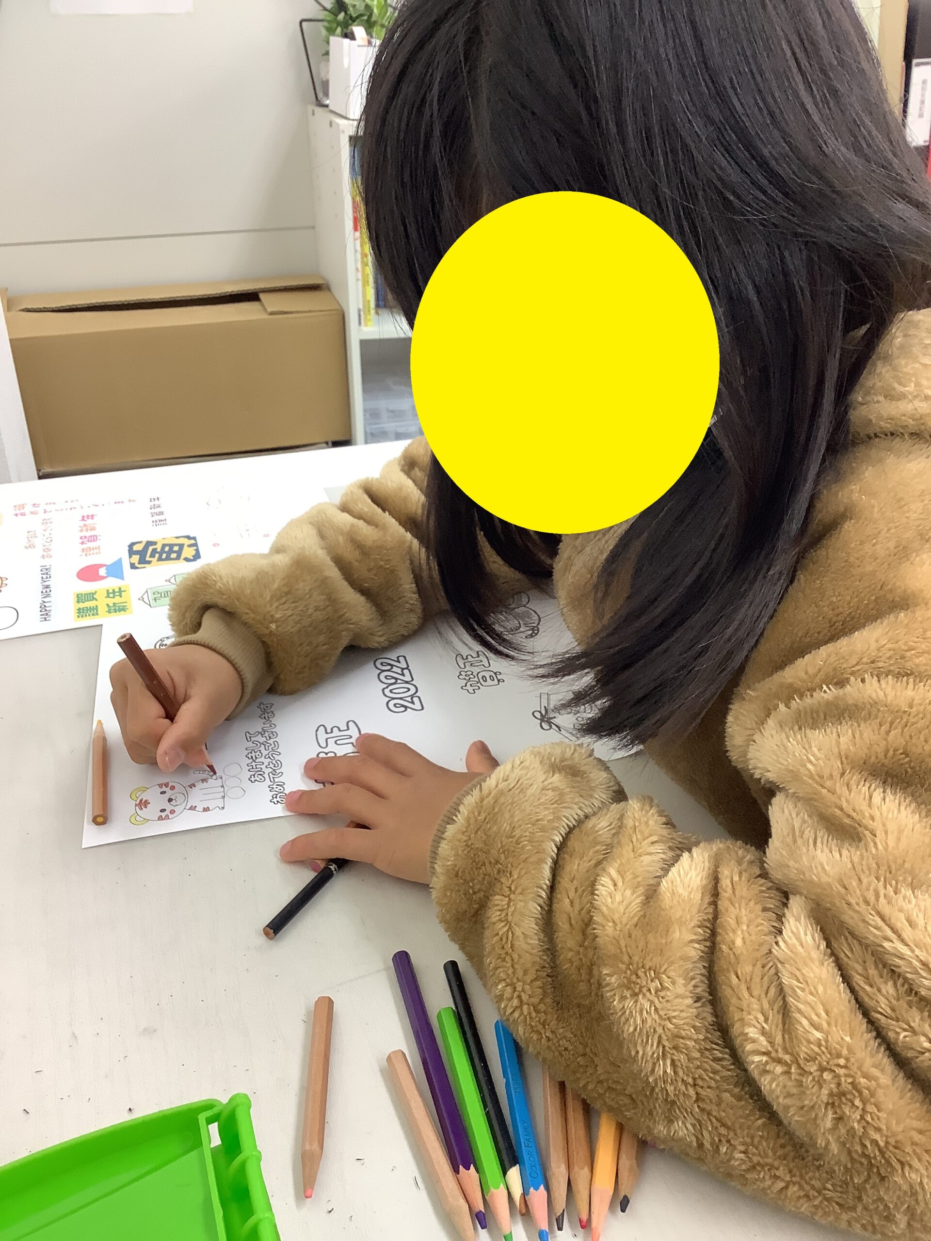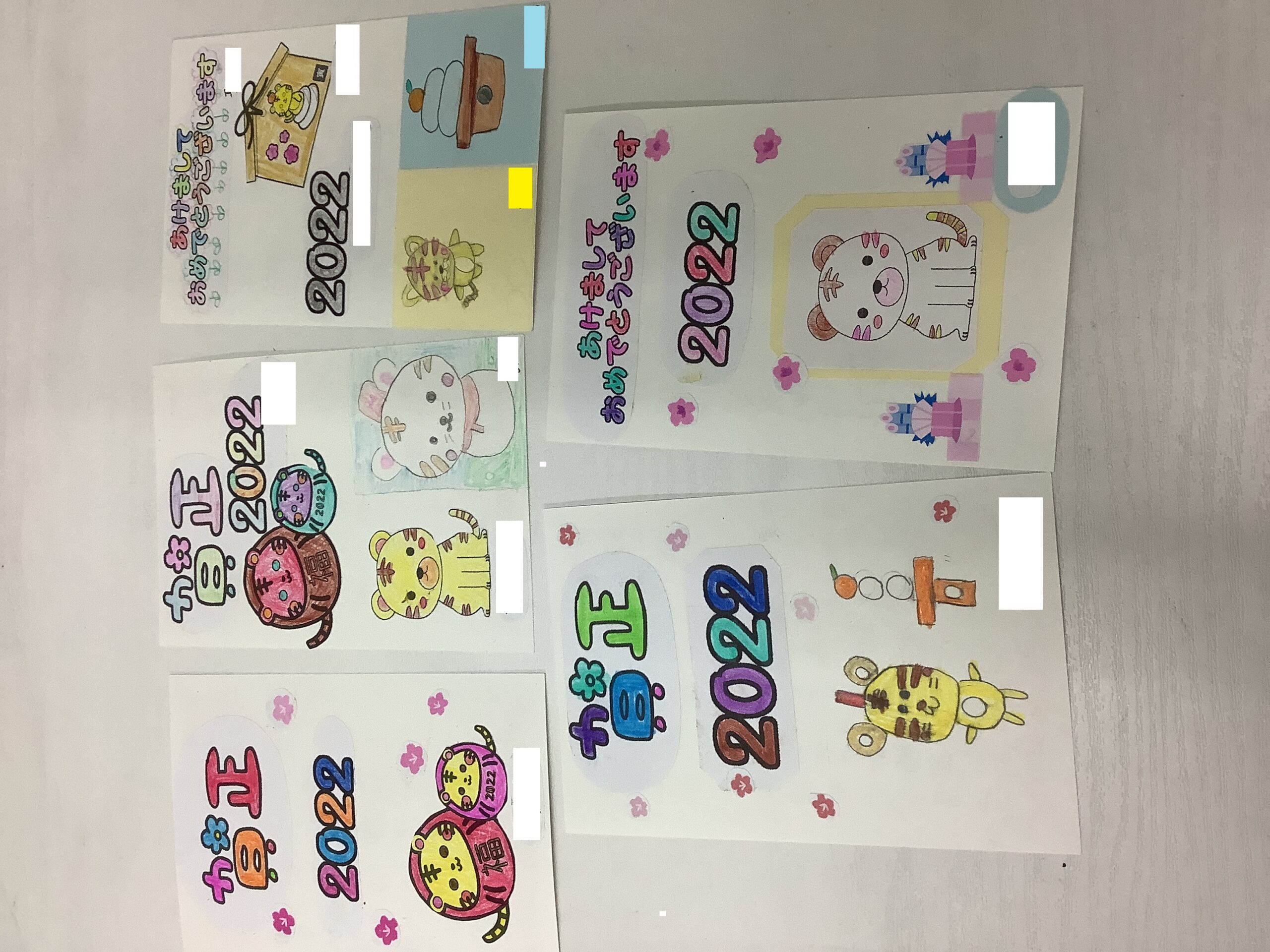 迎春や、2022年の文字、寅の絵などは自由に色鉛筆で塗ってもらいました。色塗りはみんな楽しそう!グラデーションにしたり、一文字一文字色を変えるなど、カラフルに塗り上げてくれました。