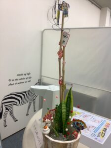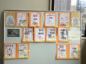 入口のボードには皆が描いてくれた年賀状が飾られています。素敵な新年のギャラリーになっています。
