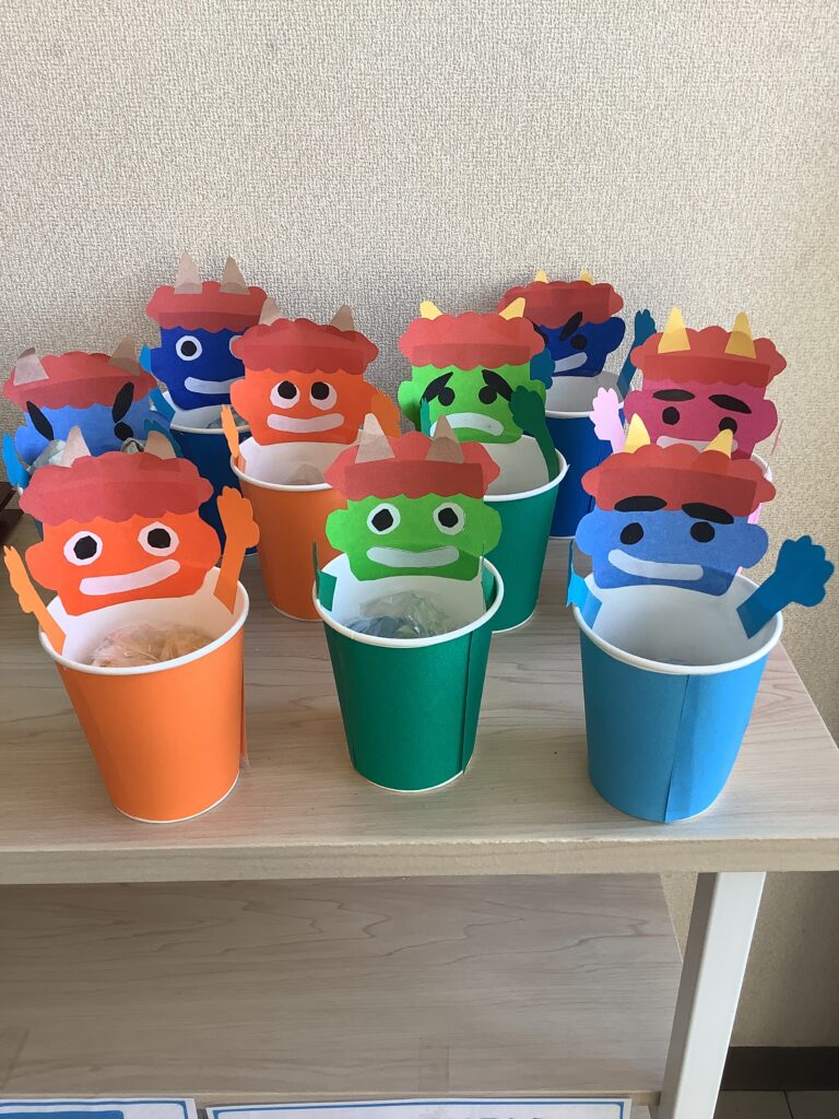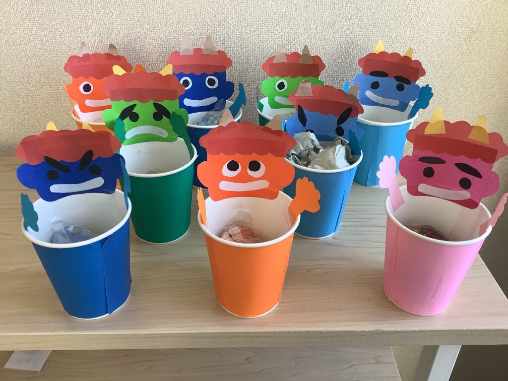 紙で作った豆を鬼の顔に投げるとカップの中に入るんです!作った後も楽しめる工作でした。「鬼は外!福は内!」と、ご家族と一緒に豆まきをして遊んでくれていると嬉しいです。早く感染症拡大の状況が一日も早く収束しますように・・・