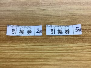 スタンプがいっぱいになると、引換券を受け取り、景品と交換です。
