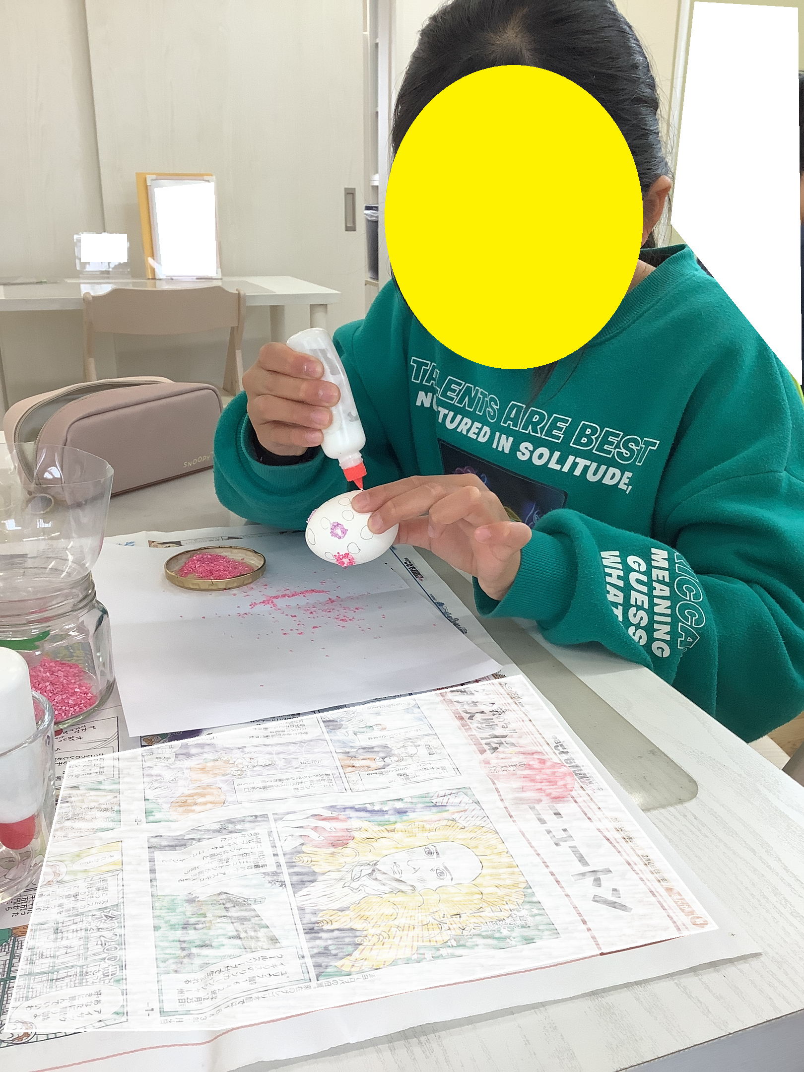 今回は卵の殻にプラス、これまた殻で作られたカラーサンドで絵柄を描いてイースターエッグを仕上げてもらいました。