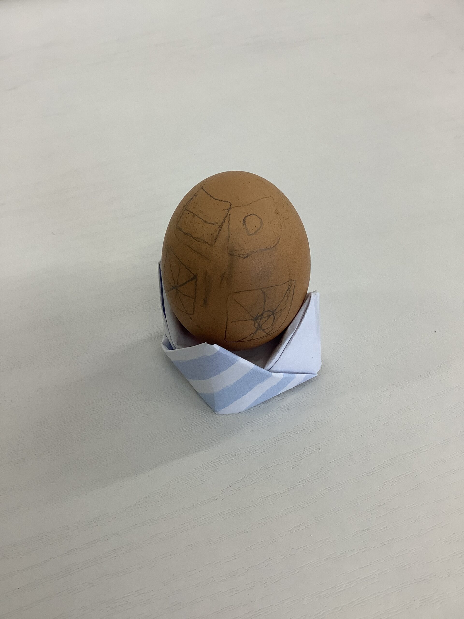 せっかく下絵を描いた卵を落してしまいパリン😢、下絵を描く時に卵を持つ手に力が入りパリッ😢