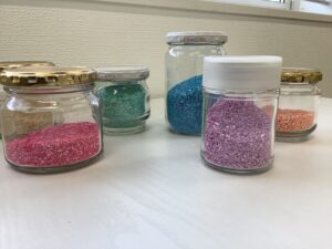 今回の作業では、使い終わったカラーサンドを、色が交じり合わないようにそれぞれの瓶に片づけることも課題の1つです。