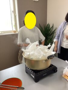 ポリ袋の空気を抜いて口をしっかり縛ったら、沸騰した大鍋の中に入れ、30分煮て出来上がりです。