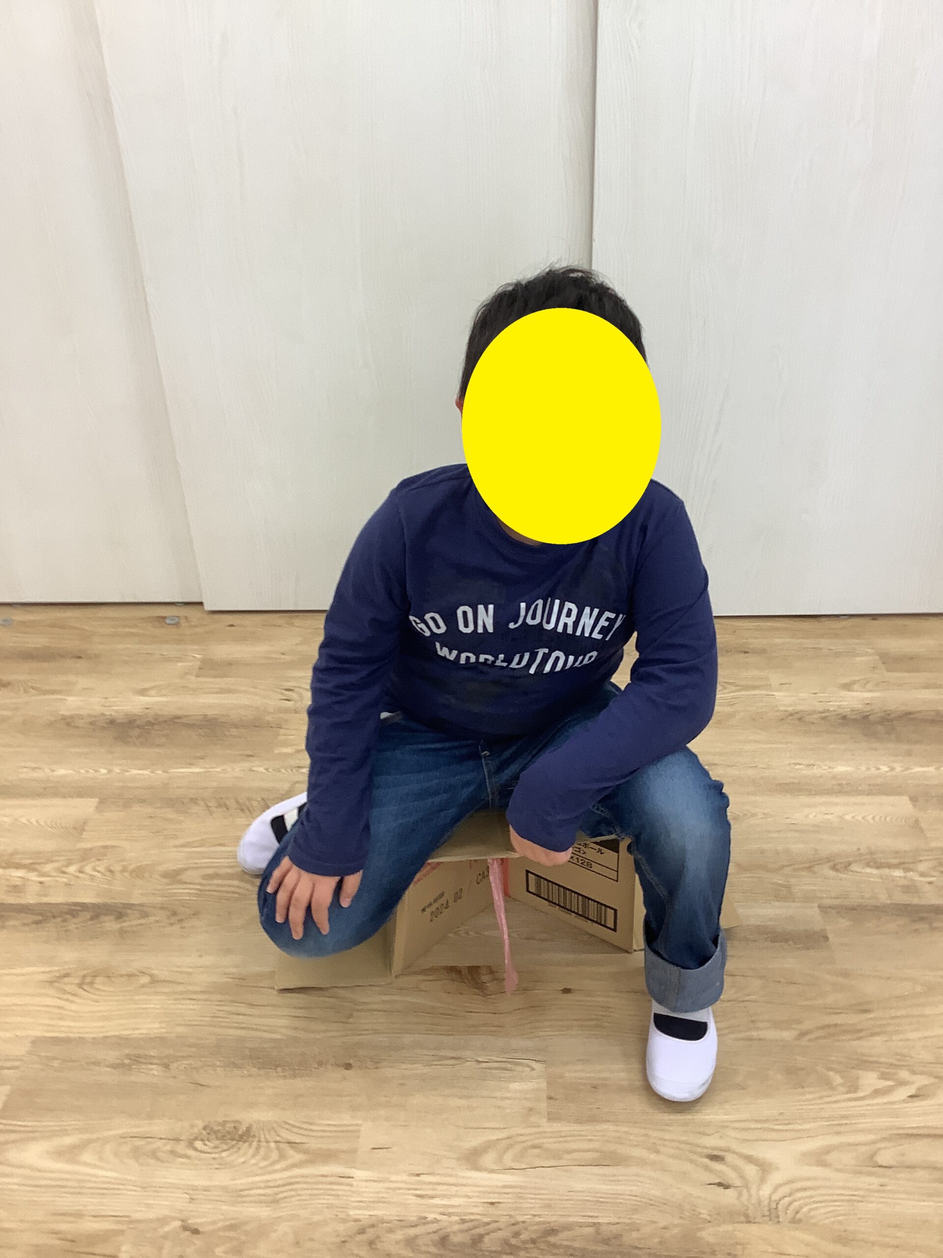 段ボールの長い面の中央を内側に折り紐で縛ります。段ボールを紐で縛る作業は子ども達にはなかなか難しい❣
