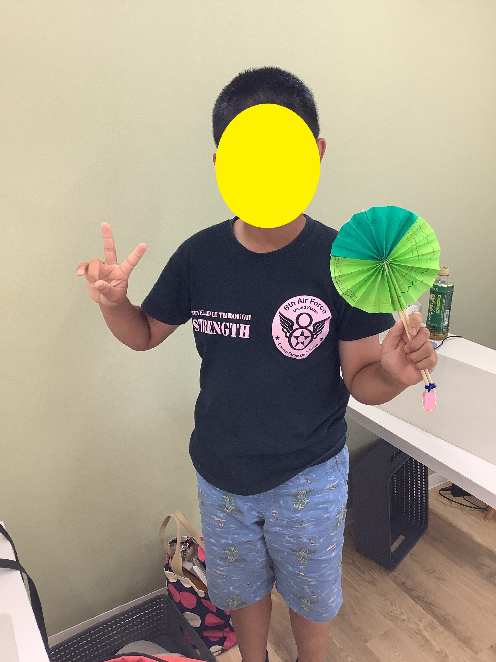 緑と青と黒の3色の色紙で作成のFさん。