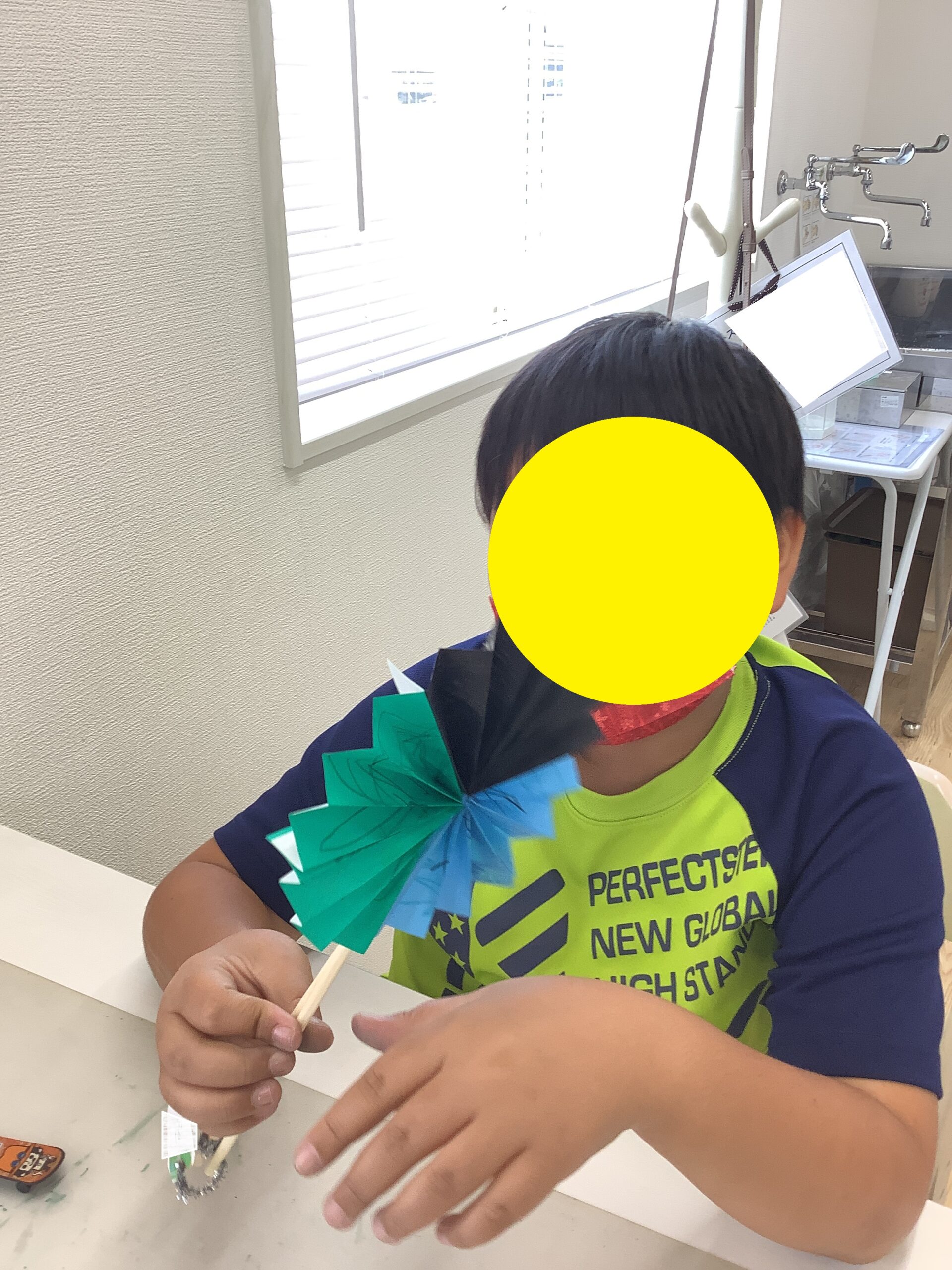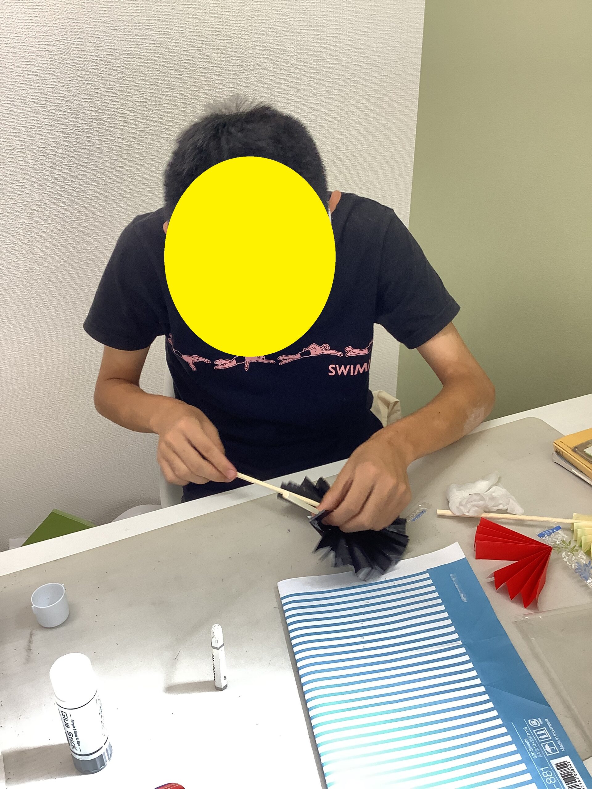 黄色1枚と青色2枚の色紙を選んでうちわ作りにチャレンジのMさん。