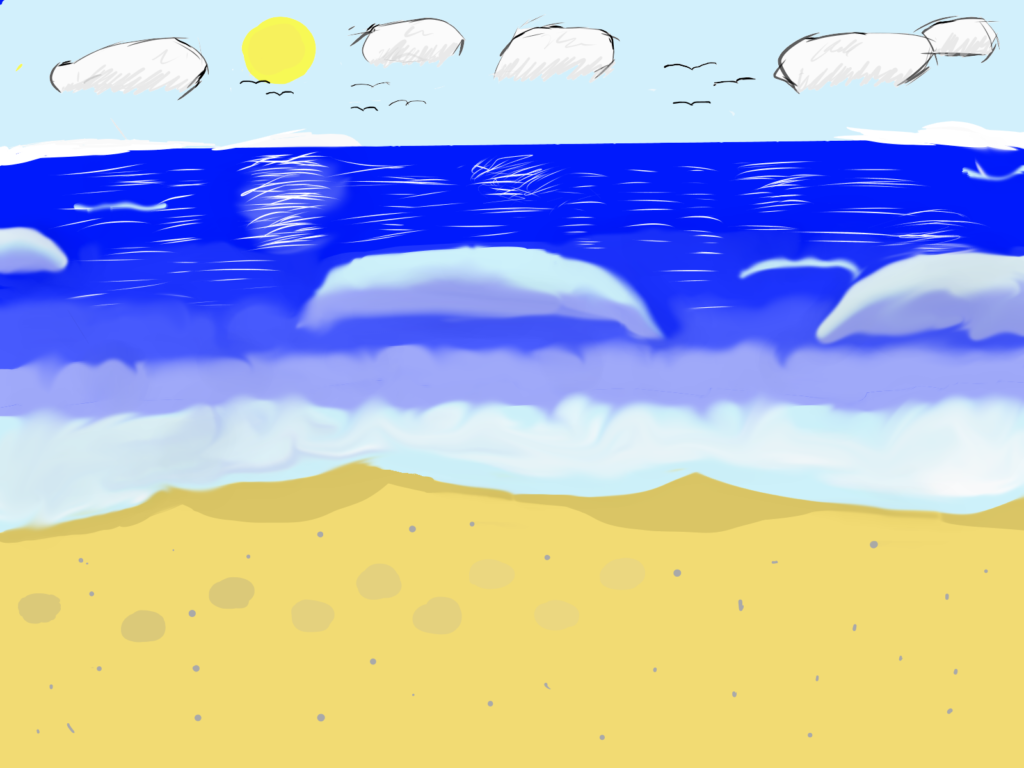 夏空に青い海、砂浜には足跡もいくつか見えます。夏の思い出に浸れそうな作品になりました😊