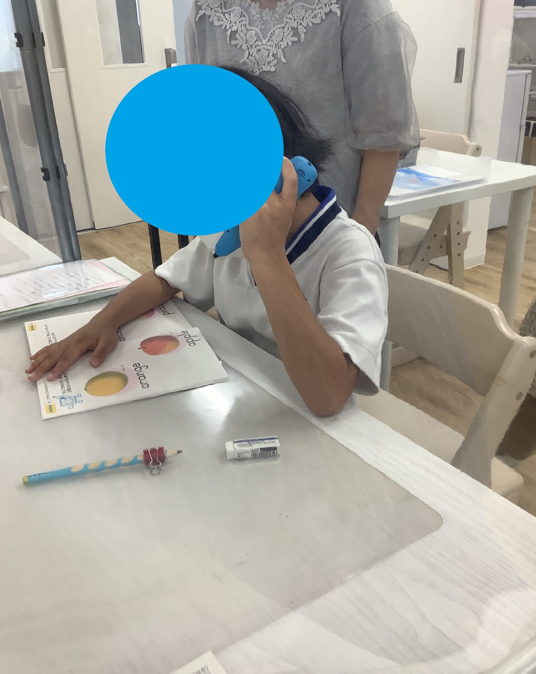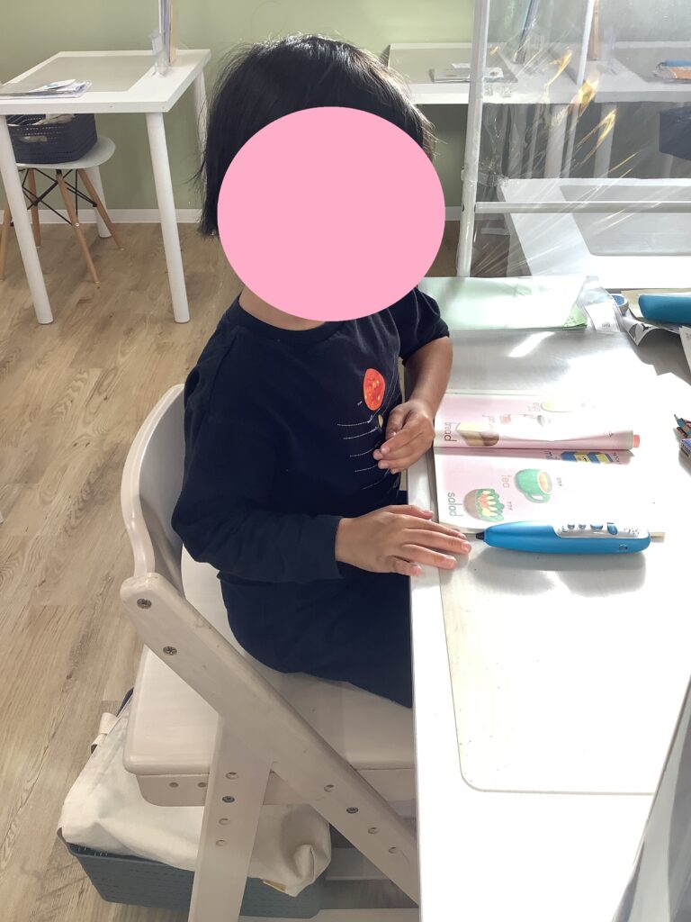 徐々に学習の仕方にも慣れ、もう一度聞きたいときには自分で再度タッチをし、真剣な表情で聞く事が出来ています。ミスなしで復唱が出来た際には嬉しそうな笑顔も見られました😊