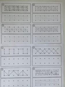 国語のくもんを始める前に、漢字など複雑な形を把握する練習として、この点つなぎのビジョントレーニングを毎回行ってもらっています。