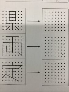 今後は板書の練習にもなるように、見本を少し離れた位置に置き、実際に漢字の点つなぎの練習をしてもらおうと思っています。