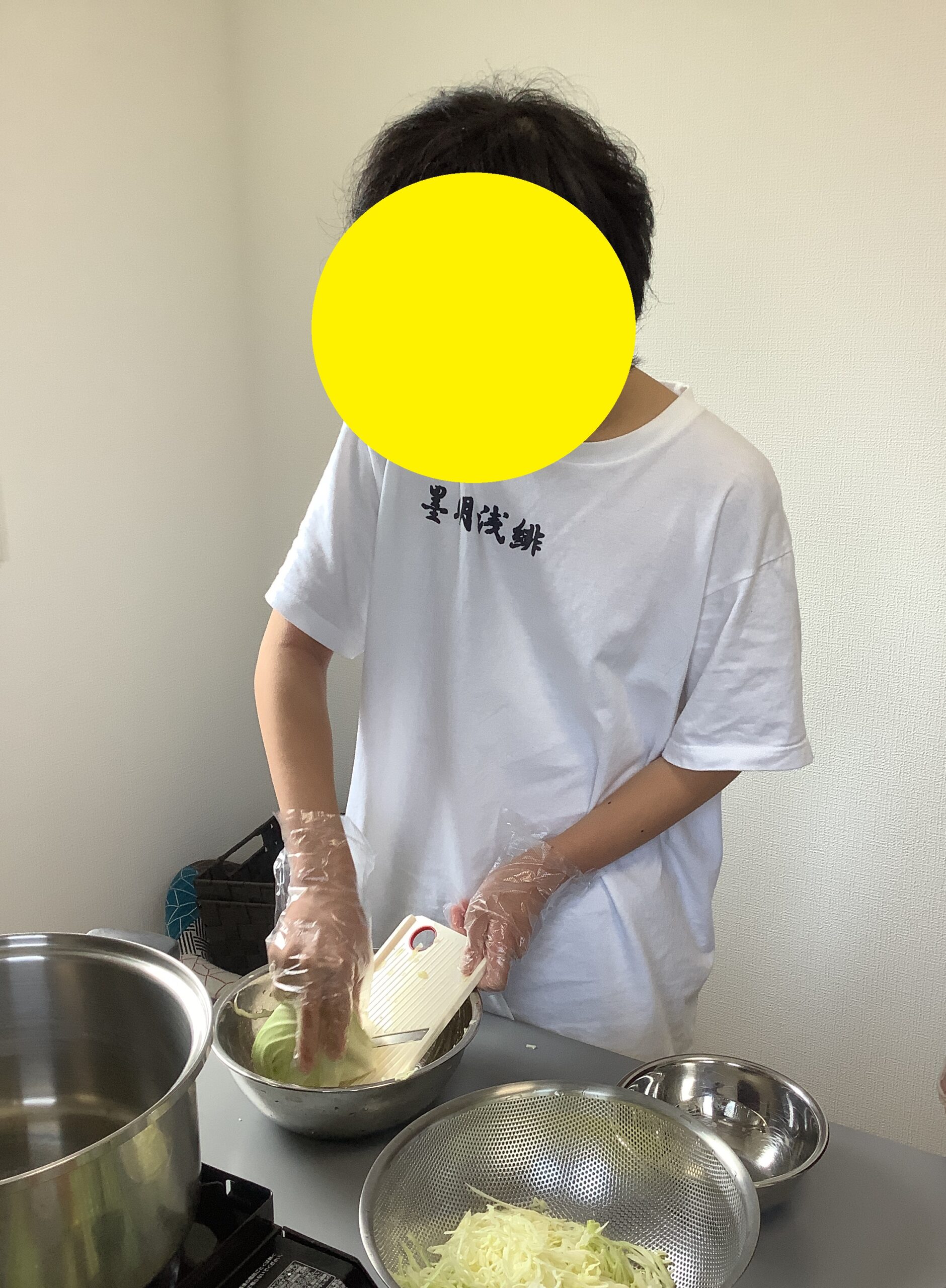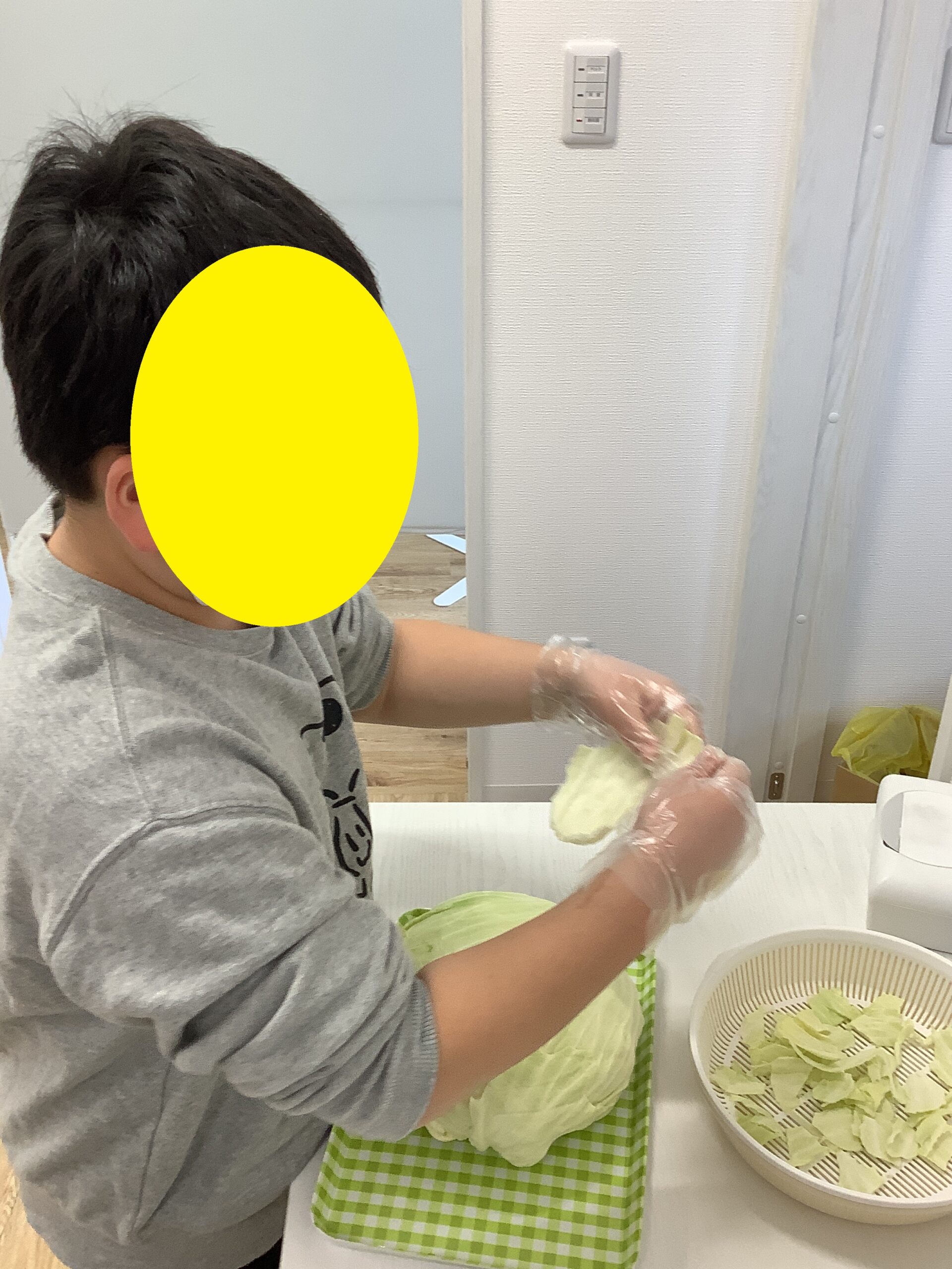 スライサーを使ってのキャベツ切りは、手を切らないように手袋は2重です。